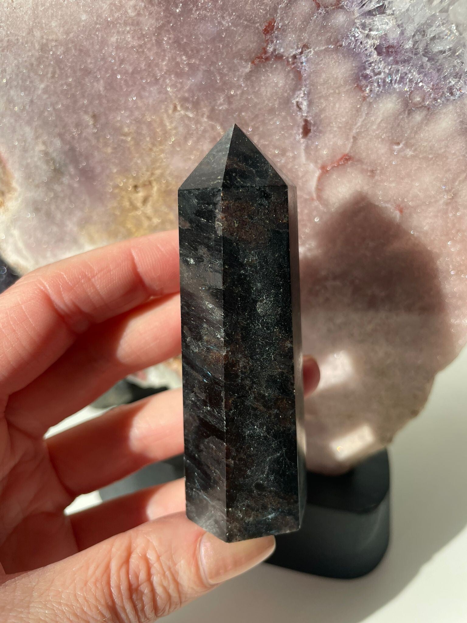 Astrophylliet is een steen met een mysterieus randje. In eerste instantie lijkt hij donker en stoer, maar als je goed kijkt, zie je overal kleine blauwe fonkeltjes oplichten – alsof de nachtelijke sterrenhemel zich in het gesteente heeft verstopt. Elke keer dat het licht erop valt, ontdek je weer iets nieuws.