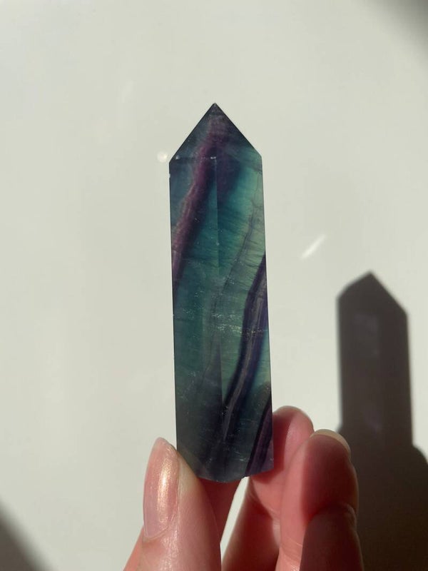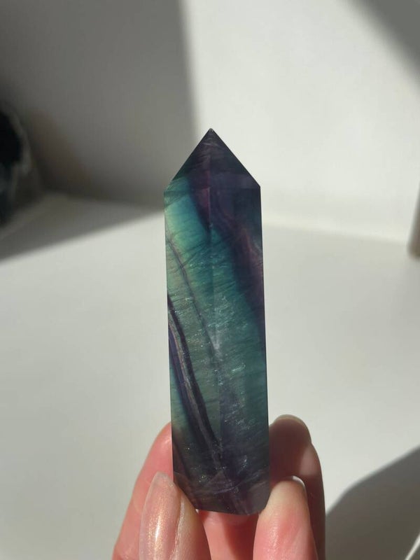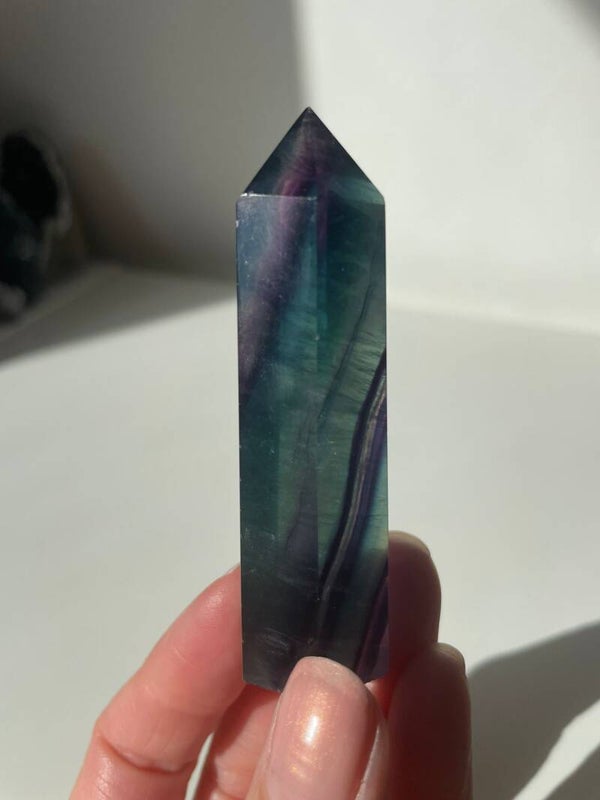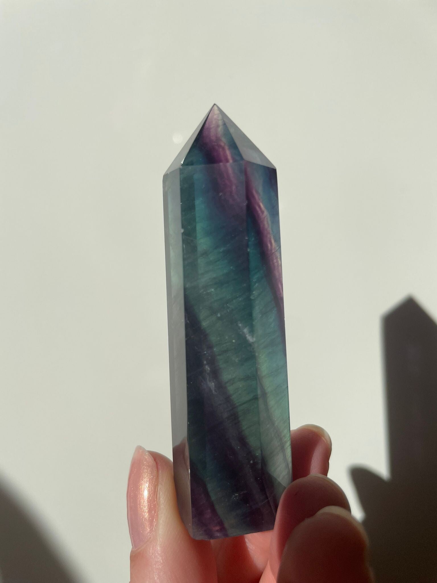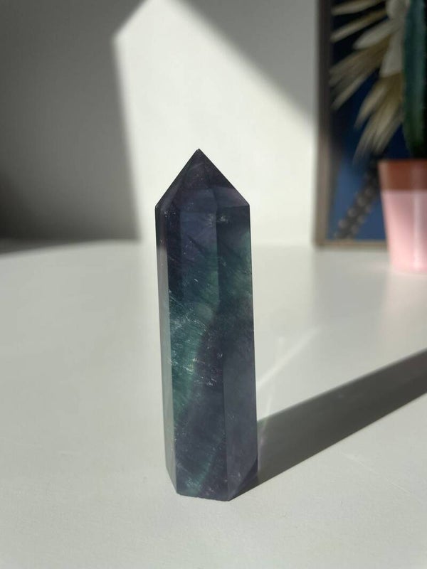 Regenboogfluoriet doet zijn naam eer aan: deze steen laat vaak prachtige lagen zien in paars, groen, blauw en soms zelfs geel. Elke laag is een nieuw stukje natuurkunst, waardoor geen twee stukken ooit hetzelfde zijn.
