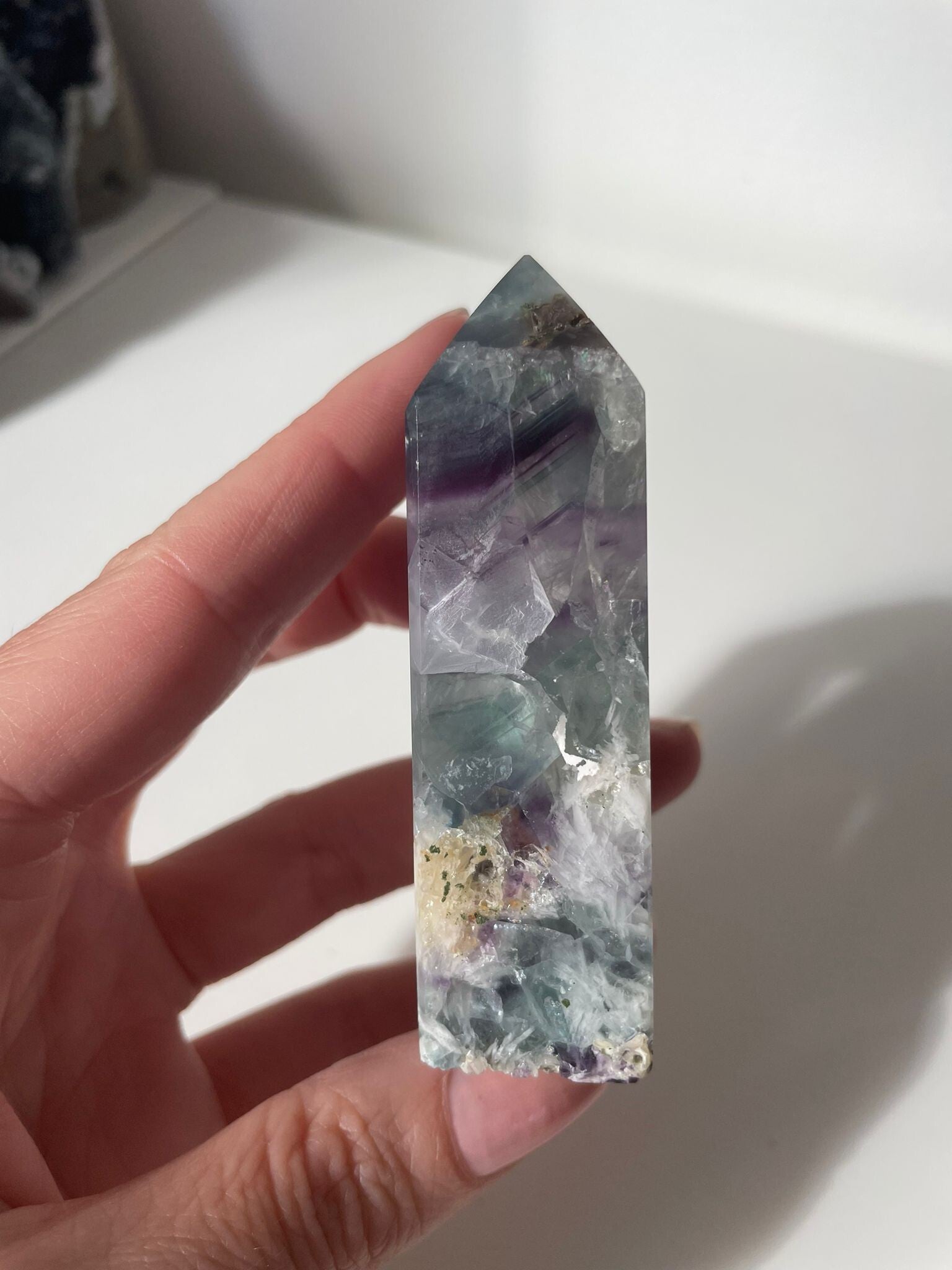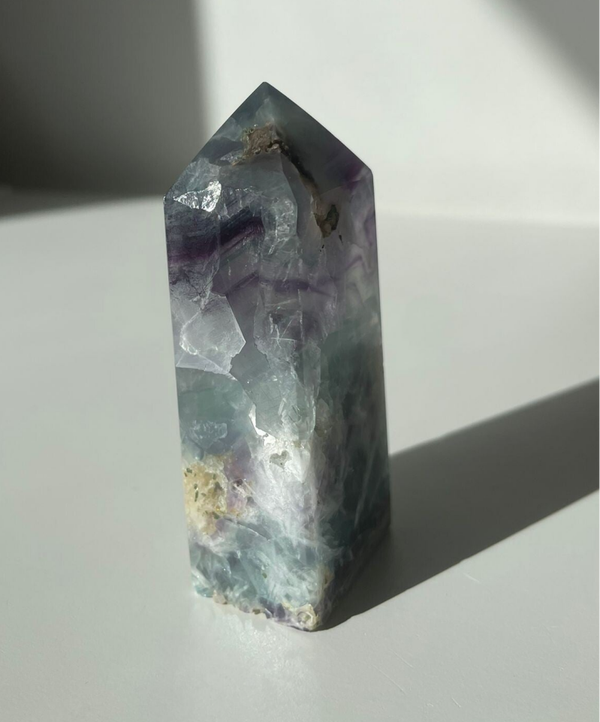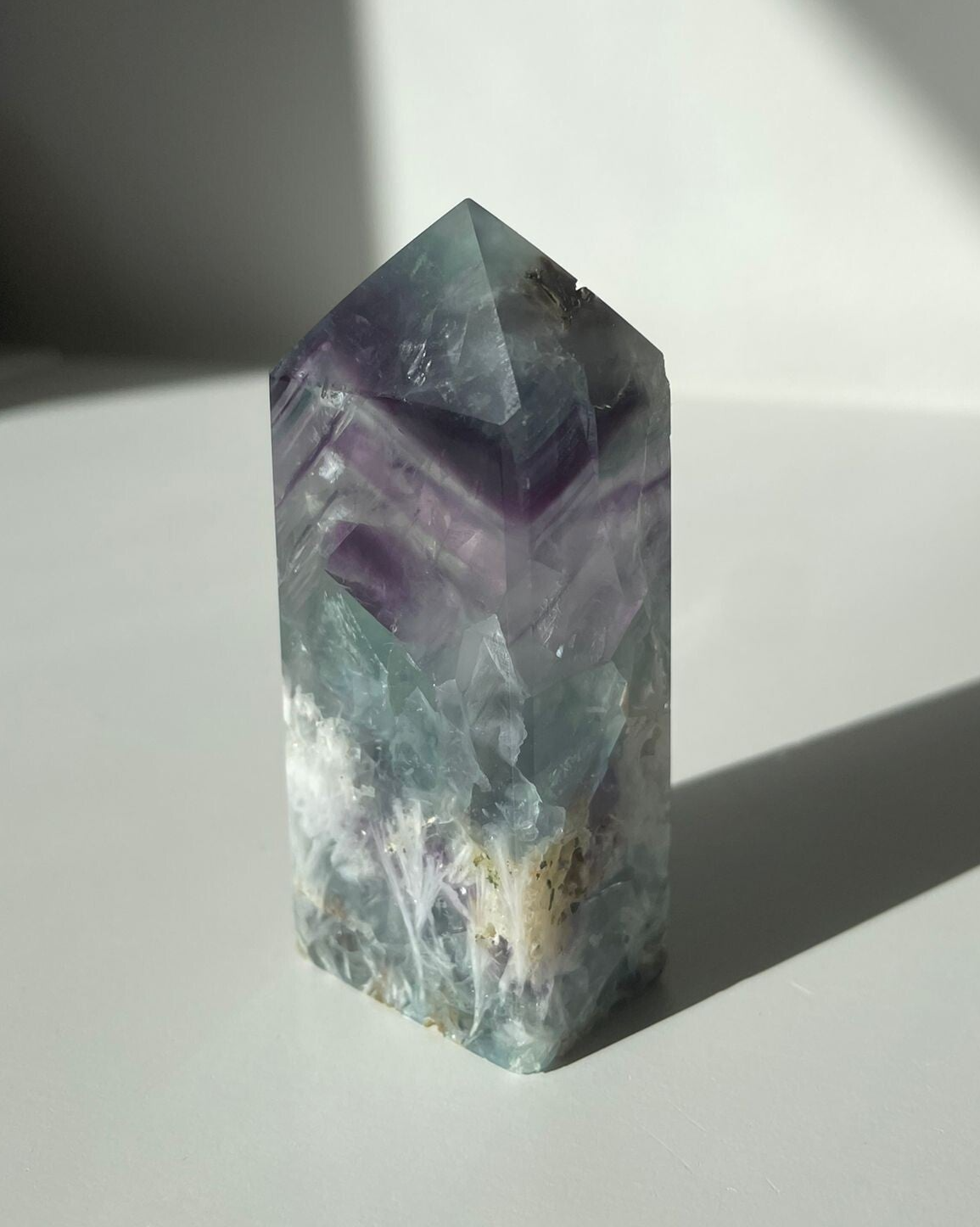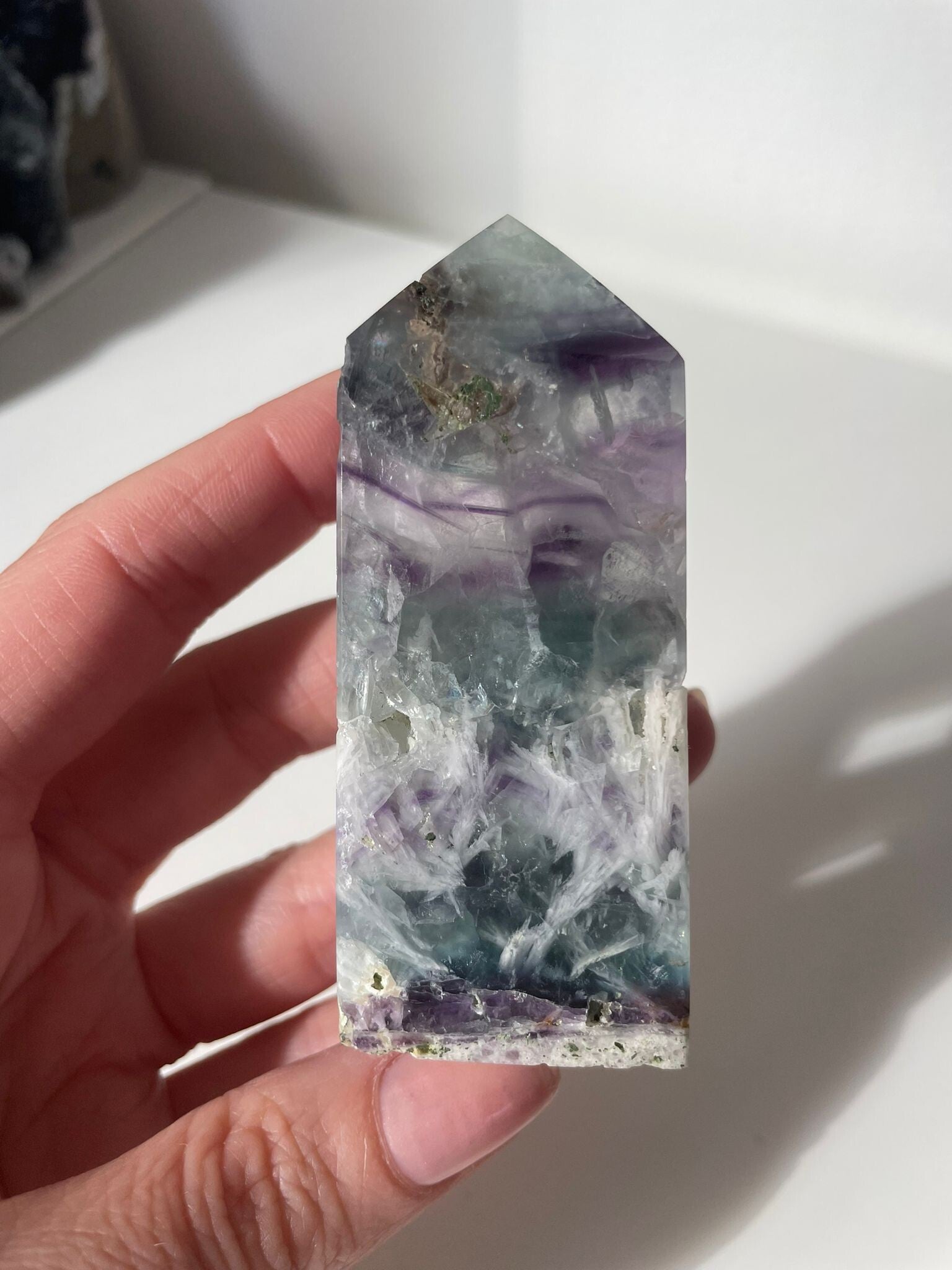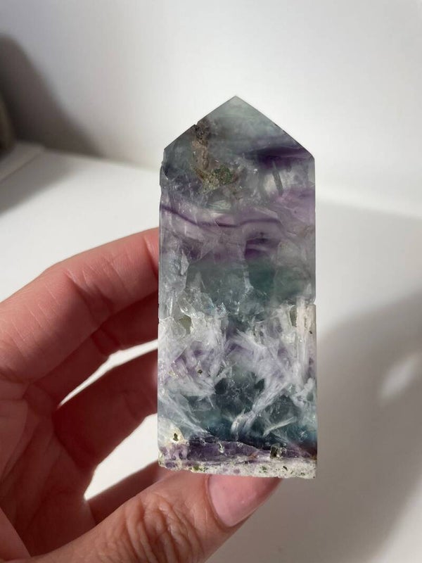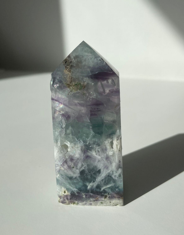 Sneeuwvlok fluoriet is een echte blikvanger: zachte groene en paarse tinten met lichte “sneeuwvlokken” die door het kristal dwarrelen. Deze bijzondere tekening ontstaat wanneer verschillende lagen fluoriet elkaar kruisen, waardoor het lijkt alsof er kleine ijssterretjes in de steen gevangen zitten. Perfect voor iedereen die houdt van stenen met een dromerige, bijna sprookjesachtige uitstraling.