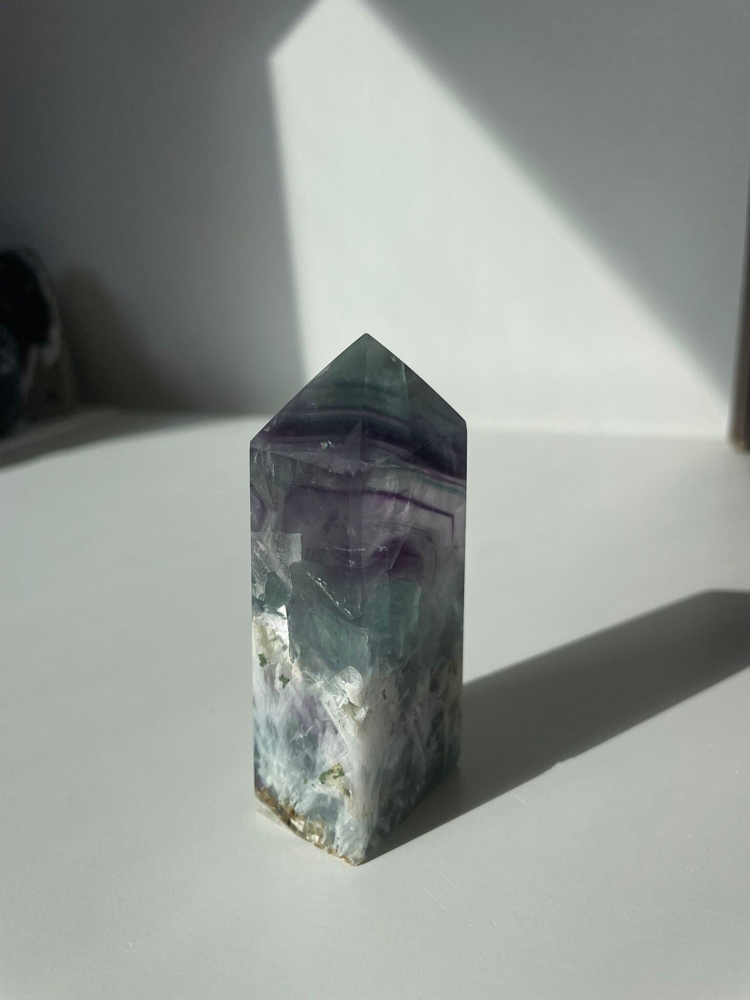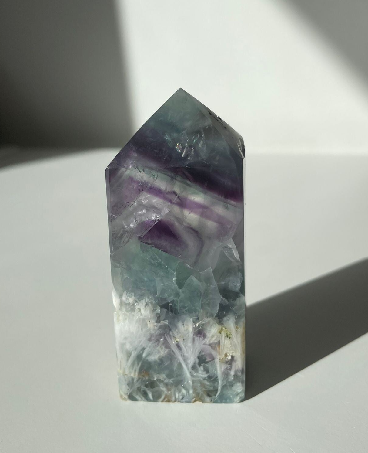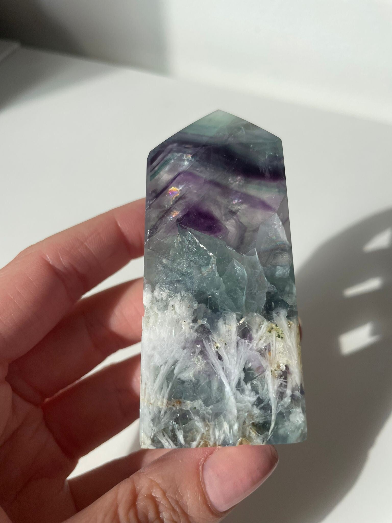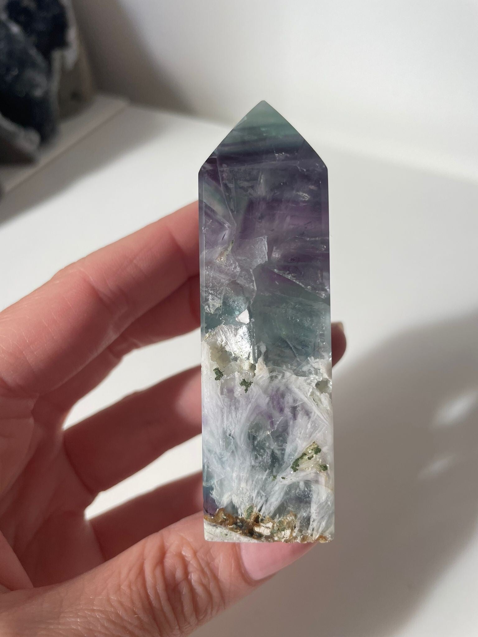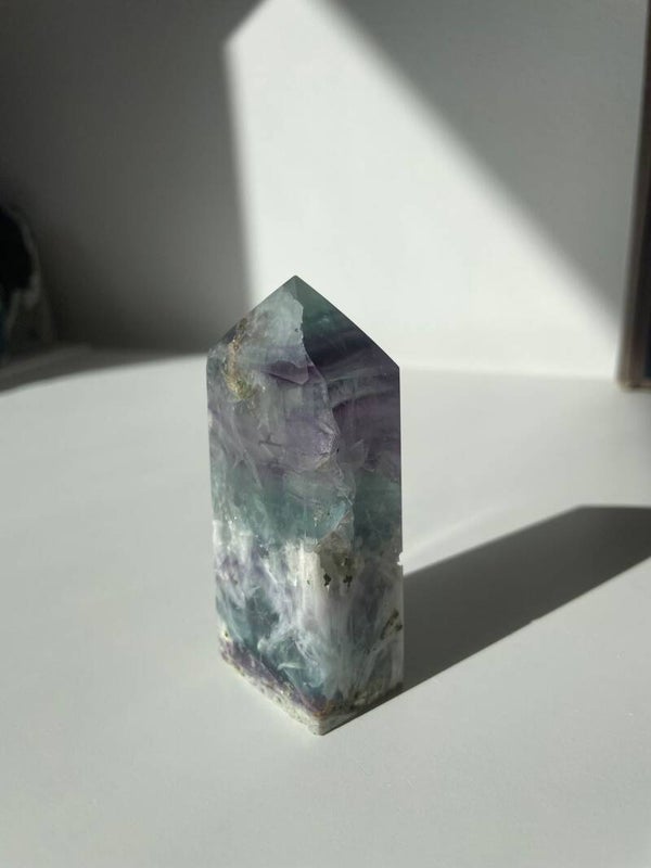 Sneeuwvlok fluoriet is een echte blikvanger: zachte groene en paarse tinten met lichte “sneeuwvlokken” die door het kristal dwarrelen. Deze bijzondere tekening ontstaat wanneer verschillende lagen fluoriet elkaar kruisen, waardoor het lijkt alsof er kleine ijssterretjes in de steen gevangen zitten. Perfect voor iedereen die houdt van stenen met een dromerige, bijna sprookjesachtige uitstraling.