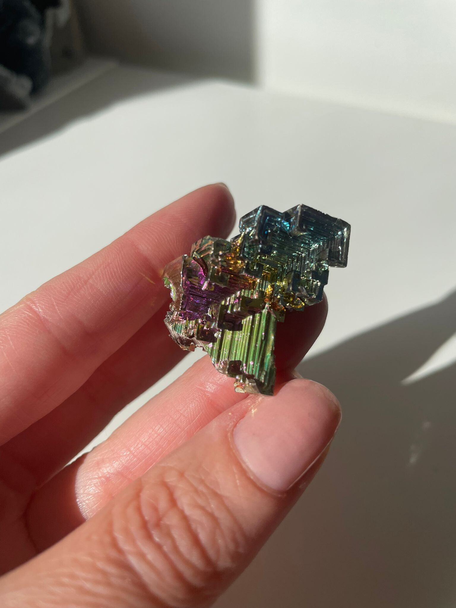 Bismut is misschien wel een van de meest opvallende ‘stenen’ in je collectie. Geen natuurlijke groeivorming zoals bij bergkristal of amethist, maar een metaal dat – wanneer het langzaam wordt afgekoeld – prachtige geometrische vormen en regenboogachtige kleuren laat zien. Denk aan trappen, hoekjes en glans in alle tinten van het licht.