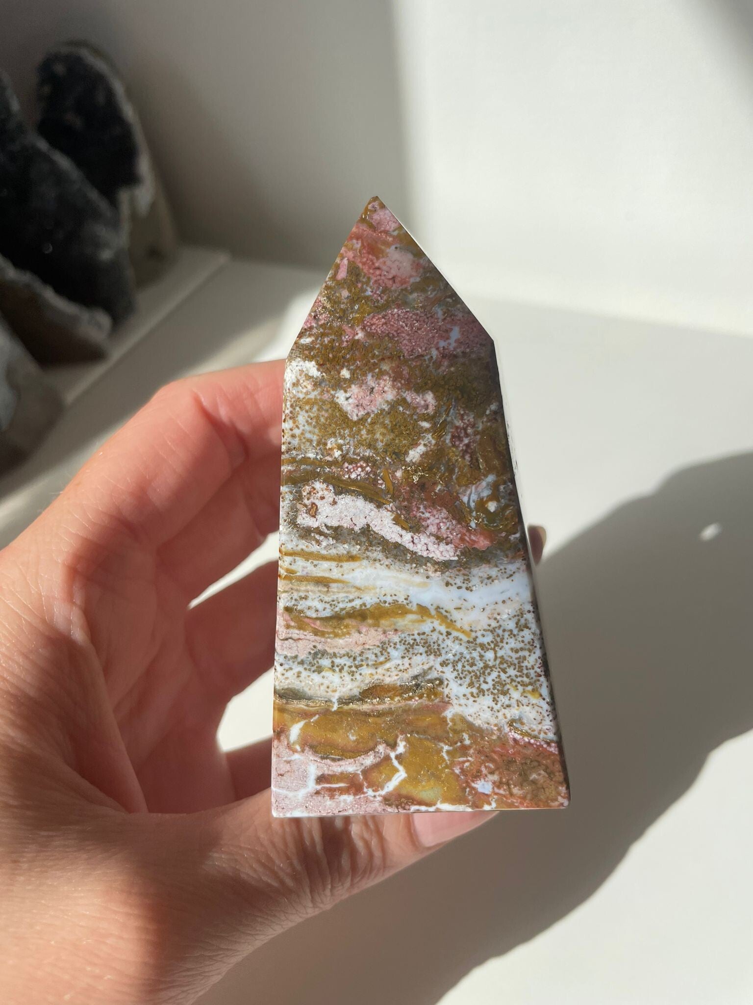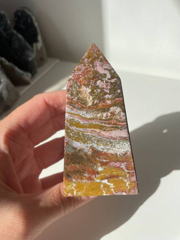 Leuk weetje: de naam “oceaan jaspis” komt van de prachtige kleuren en patronen die doen denken aan de zee, maar elke steen vertelt eigenlijk z’n eigen kleine verhaal over miljoenen jaren geologische geschiedenis!