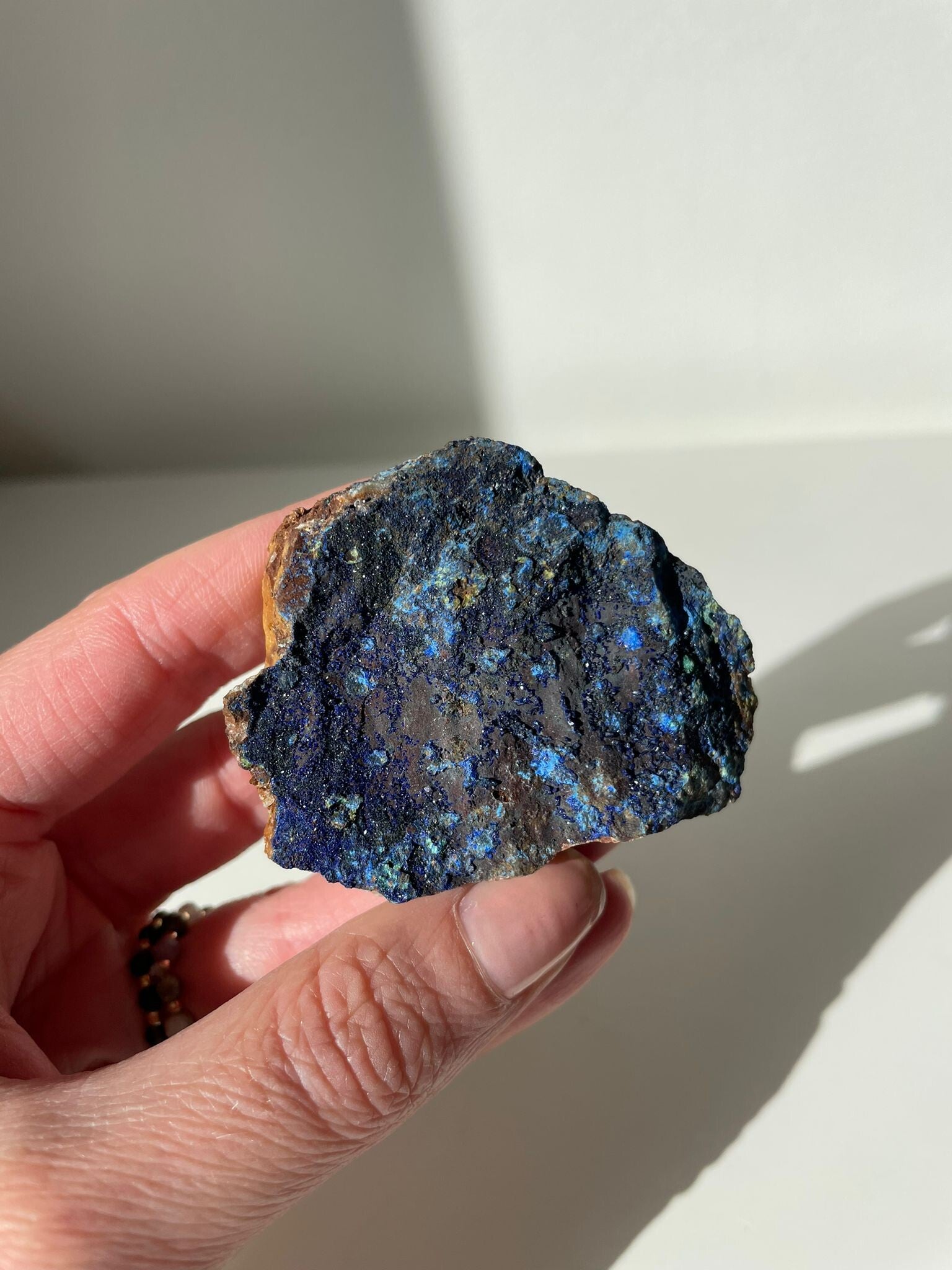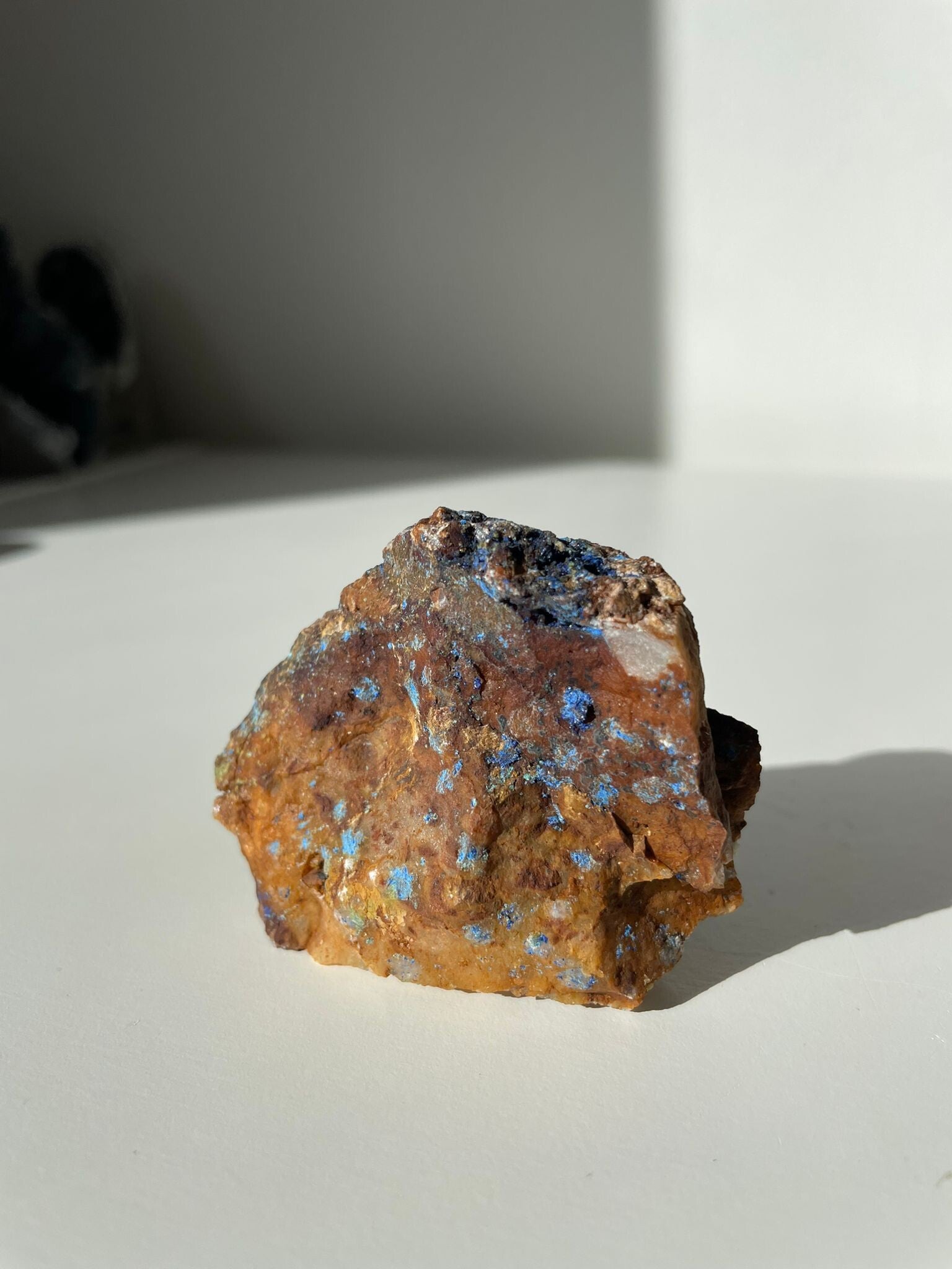Deze prachtige blauwe verschijning wordt gevonden in onder andere Marokko, Australië en de VS. Soms komt hij voor in combinatie met malachiet, en dan krijg je een prachtig blauw-groen kunstwerkje van moeder natuur.