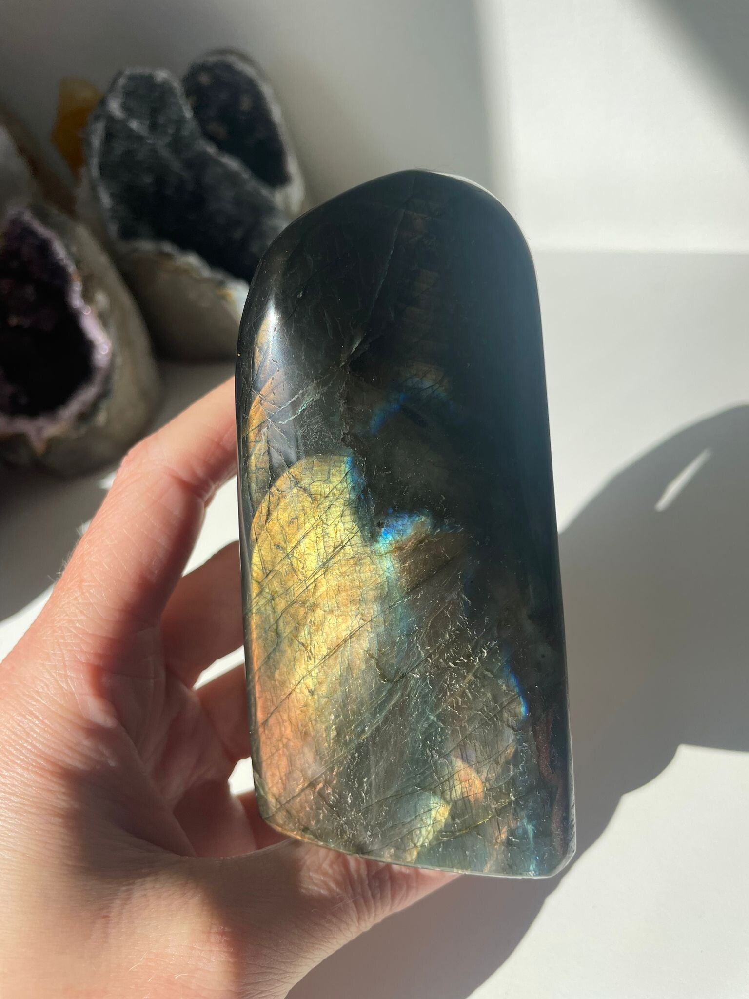 Labradoriet is een mysterieuze en betoverende steen die direct opvalt door zijn bijzondere iriserende kleuren, ook wel labradorescentie genoemd. Afhankelijk van de lichtinval kan de steen schitteren in tinten blauw, groen, goud en soms zelfs paars of oranje. Het is alsof een klein stukje noorderlicht in de steen gevangen zit.