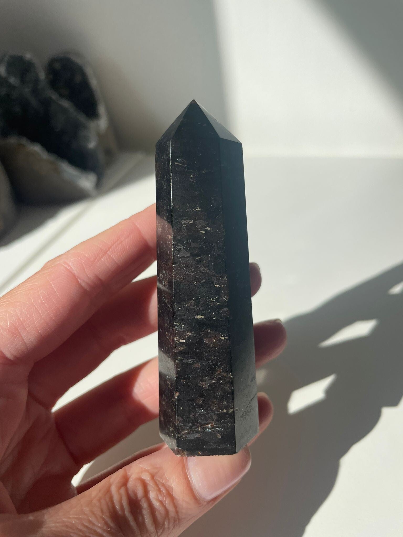 Astrophylliet is een steen met een mysterieus randje. In eerste instantie lijkt hij donker en stoer, maar als je goed kijkt, zie je overal kleine blauwe fonkeltjes oplichten – alsof de nachtelijke sterrenhemel zich in het gesteente heeft verstopt. Elke keer dat het licht erop valt, ontdek je weer iets nieuws.