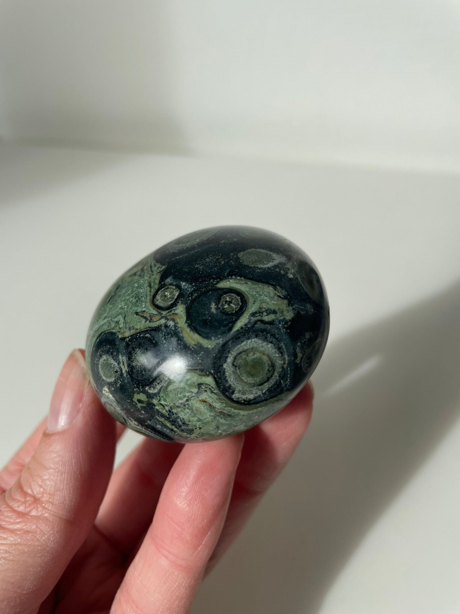 Kambaba Jaspis is een fascinerende groene steen met donkere, cirkelvormige patronen die lijken op kleine eilandjes in een diep groen meer. De steen bestaat uit fossiele algen en mineralen en is daardoor niet alleen mooi om naar te kijken, maar ook een stukje geschiedenis in je hand. Kambaba Jaspis wordt voornamelijk gevonden in Madagaskar, waar hij miljoenen jaren geleden ontstond.