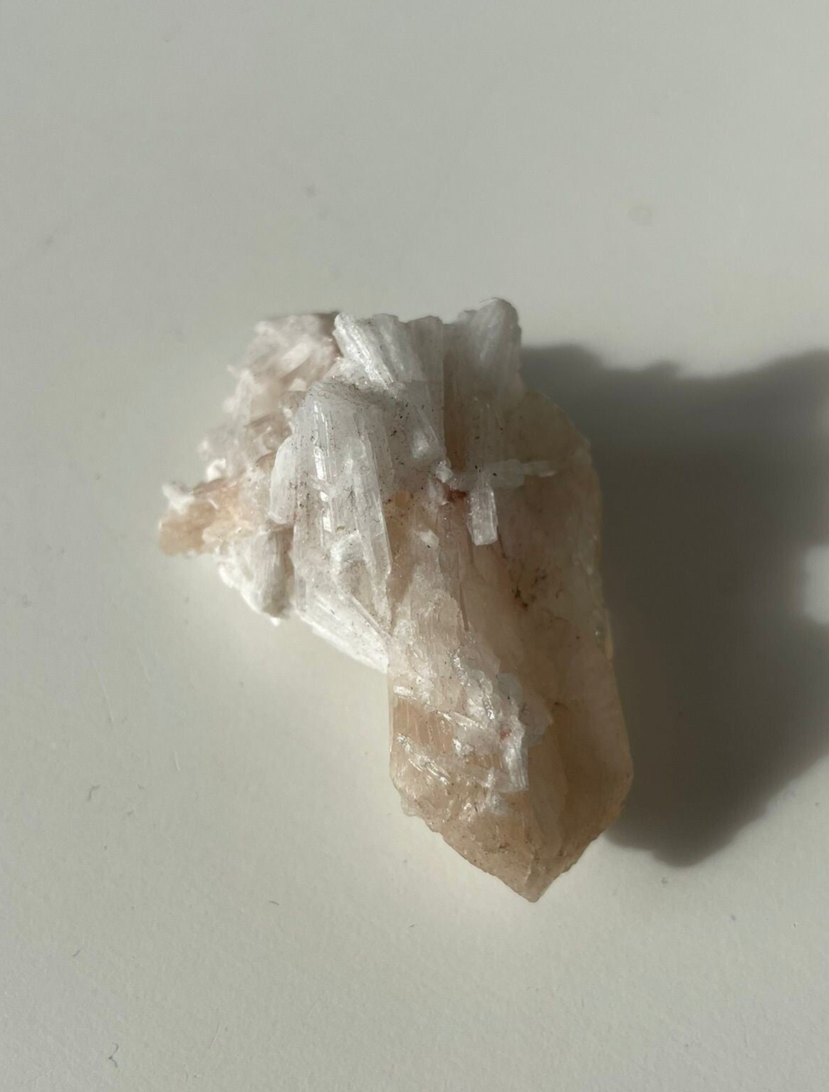 Scoleciet is een mineraal dat eruitziet alsof het gemaakt is van delicate, zijdeachtige naaldjes. De kristallen groeien in stralende bundels of waaiervormen, meestal in helder wit, crème of lichtroze tinten. Het resultaat? Een steen die bijna glowt van binnenuit, subtiel, puur en elegant.