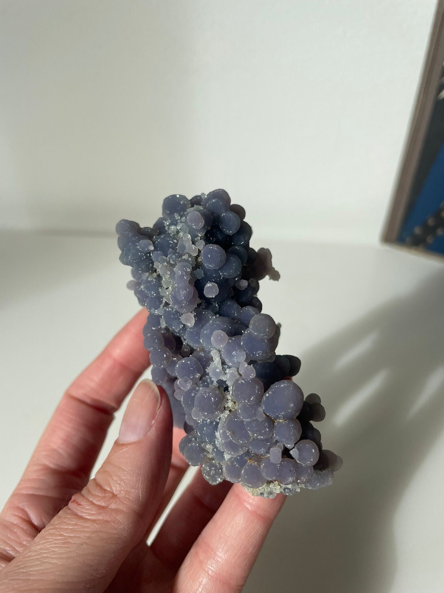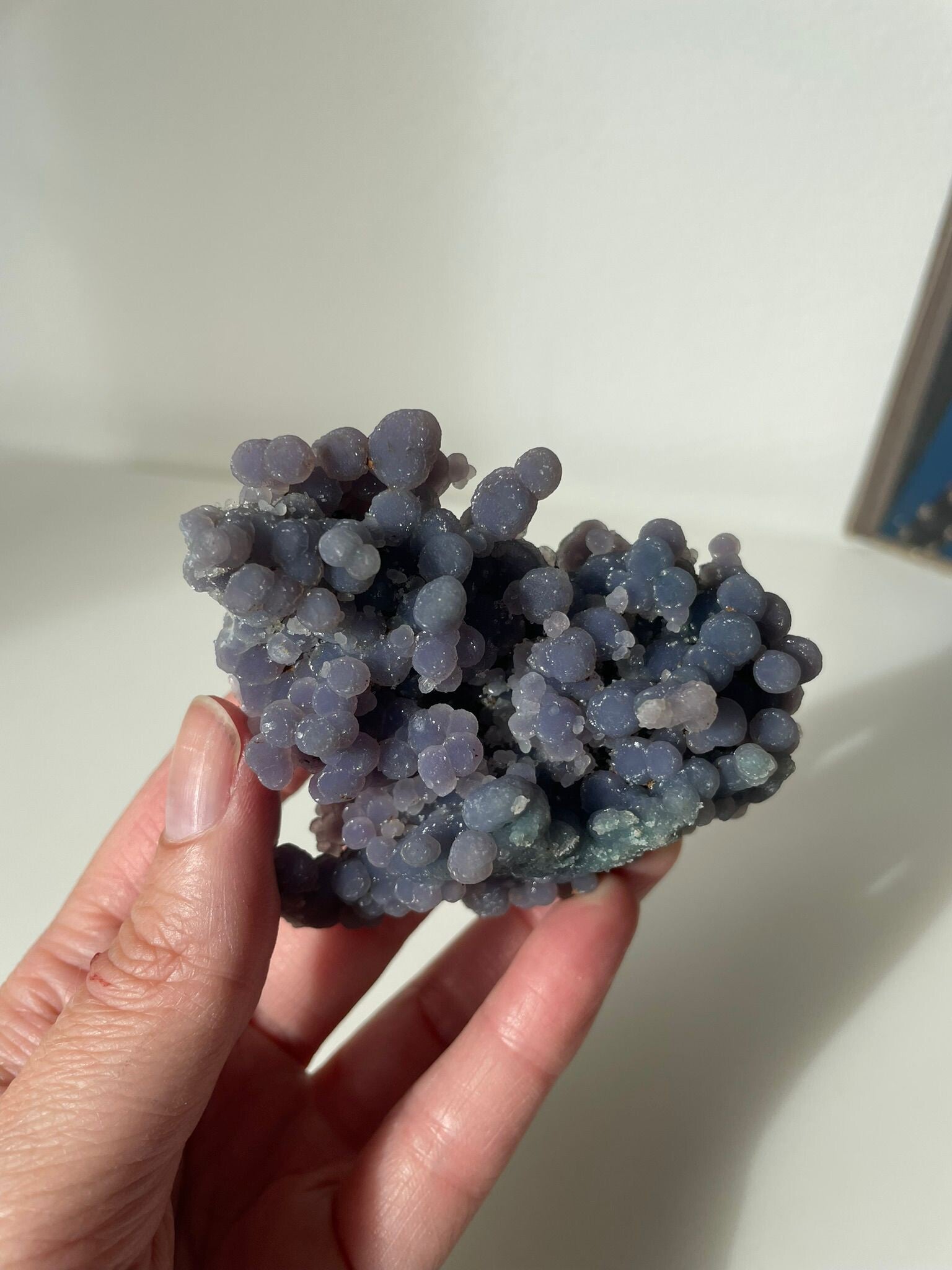 Druifagaat is een steen die meteen de aandacht trekt door z’n bijzondere, bolvormige groeipatronen die lijken op kleine druifjes. De kleuren variëren van paars en blauw tot groen en grijs, vaak gecombineerd met subtiele bandjes of glansjes. Elk stukje is uniek en voelt als een miniatuurkunstwerk van de natuur.