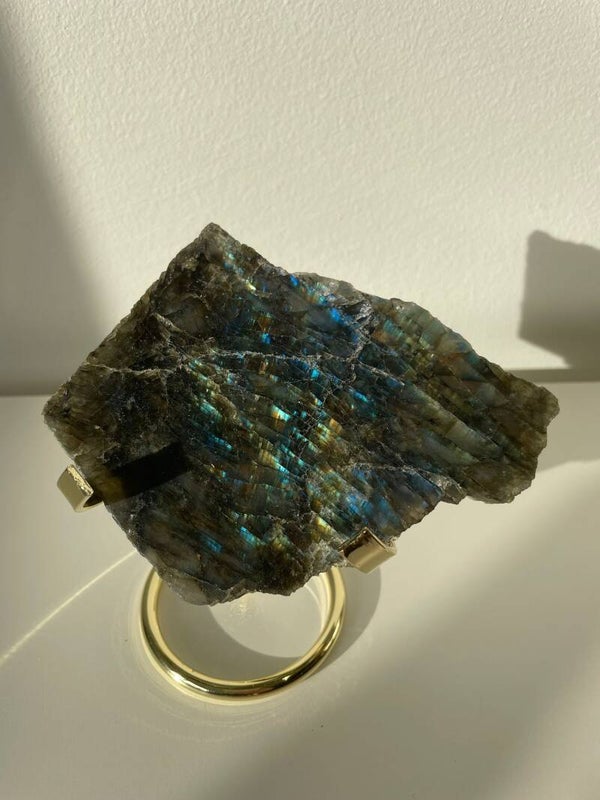 Labradoriet is een mysterieuze en betoverende steen die direct opvalt door zijn bijzondere iriserende kleuren, ook wel labradorescentie genoemd. Afhankelijk van de lichtinval kan de steen schitteren in tinten blauw, groen, goud en soms zelfs paars of oranje. Het is alsof een klein stukje noorderlicht in de steen gevangen zit.