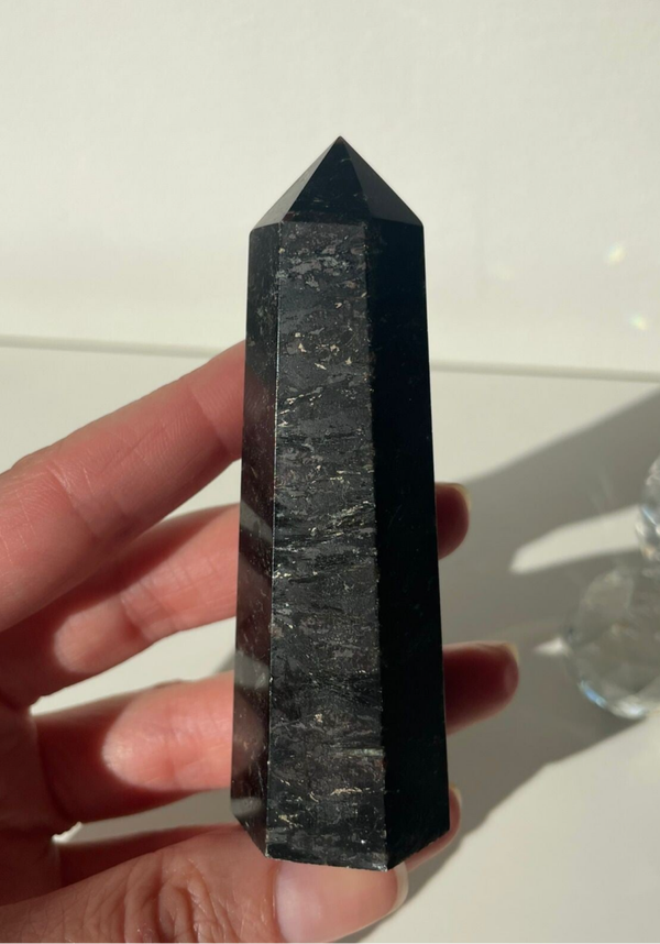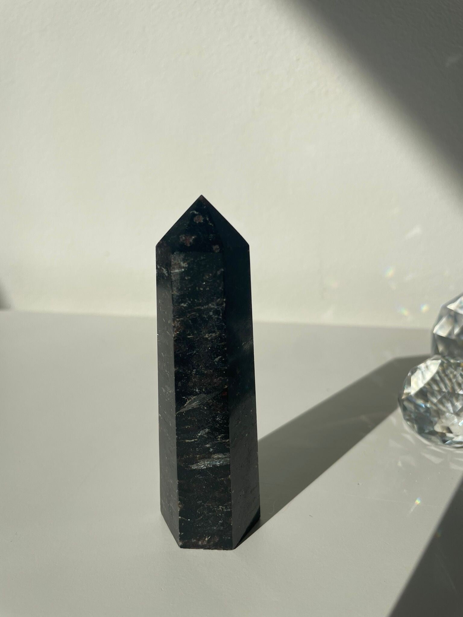 Astrophylliet is een steen met een mysterieus randje. In eerste instantie lijkt hij donker en stoer, maar als je goed kijkt, zie je overal kleine blauwe fonkeltjes oplichten – alsof de nachtelijke sterrenhemel zich in het gesteente heeft verstopt. Elke keer dat het licht erop valt, ontdek je weer iets nieuws.