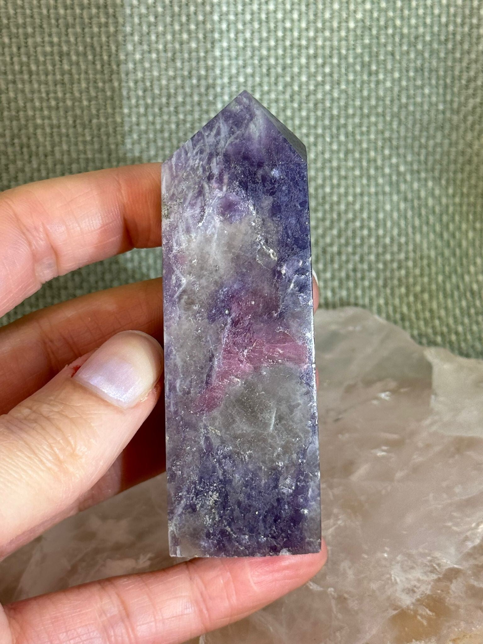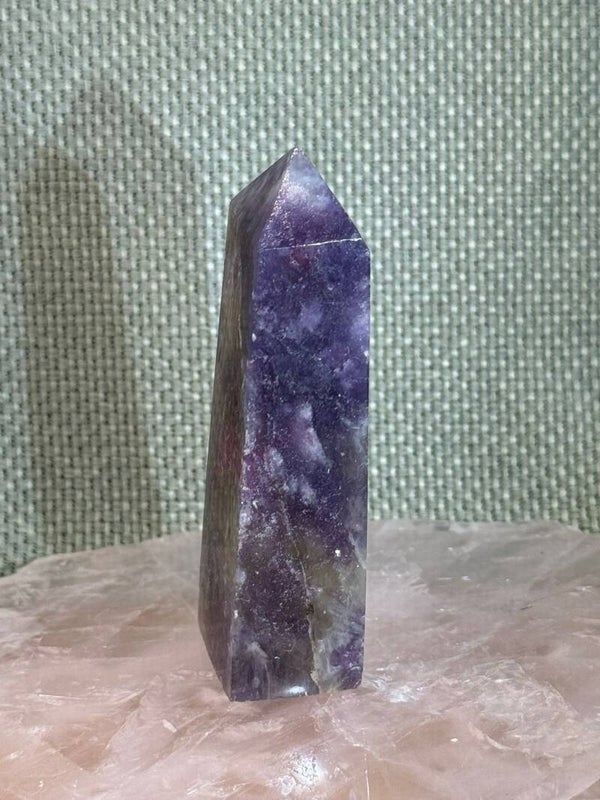 Lepidoliet is van nature rijk aan kleine glimmertjes (mica!), waardoor deze steen een subtiel sprankelend oppervlak heeft. De roze toermalijn die erdoorheen loopt, vormt mooie, vaak langgerekte insluitsels. Samen vormen ze een duo dat zowel visueel als energetisch heel harmonieus is.
