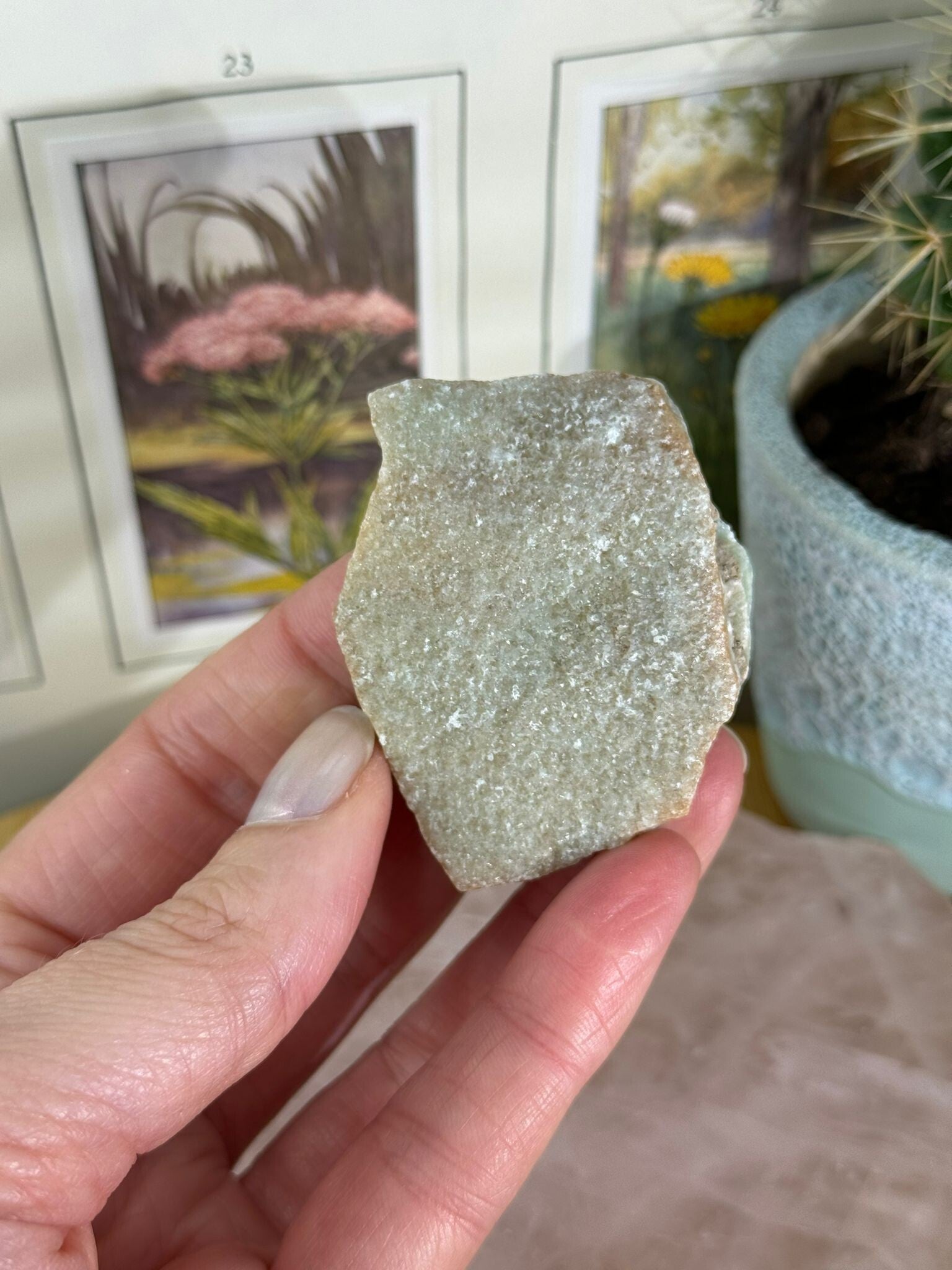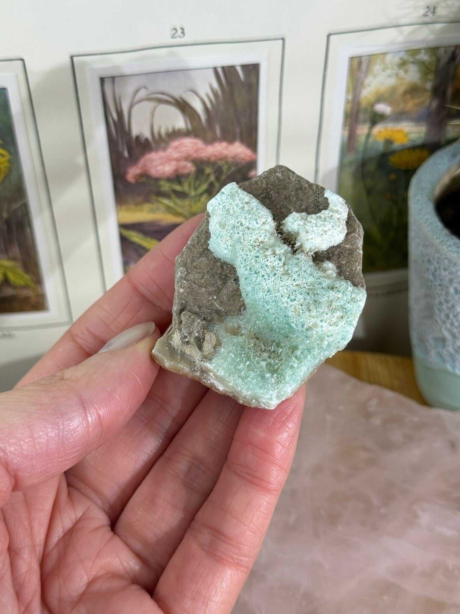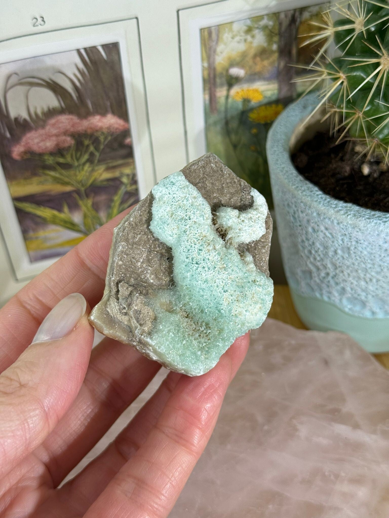 Blauwe aragoniet is zo'n steen waar je vanzelf wat rustiger van wordt. Met z’n dromerige blauwtinten en zachte uitstraling doet hij denken aan kalme zeeën of een frisse lucht op een heldere dag. Geen donderwolken hier – alleen een beetje helderheid en ontspanning.