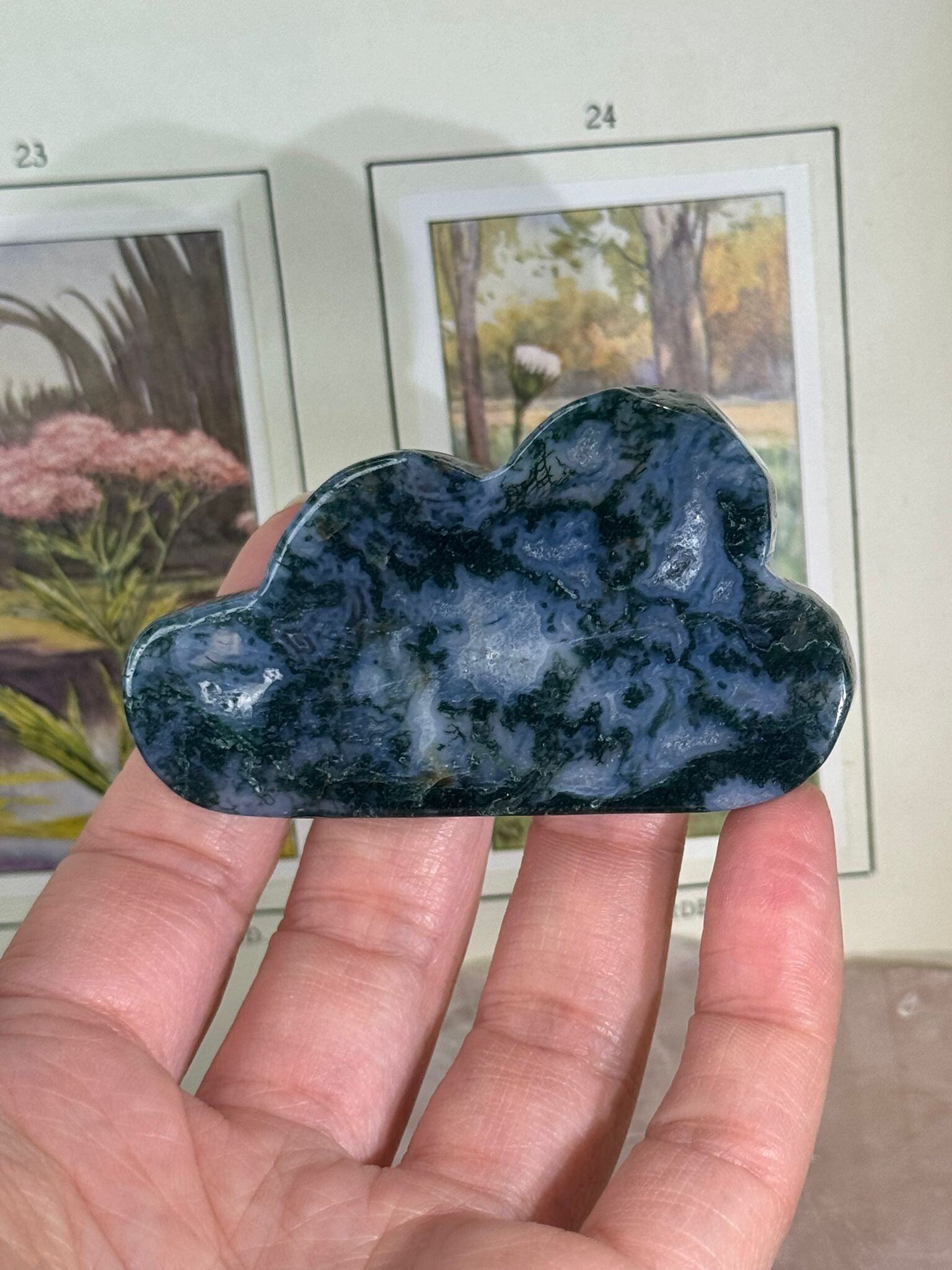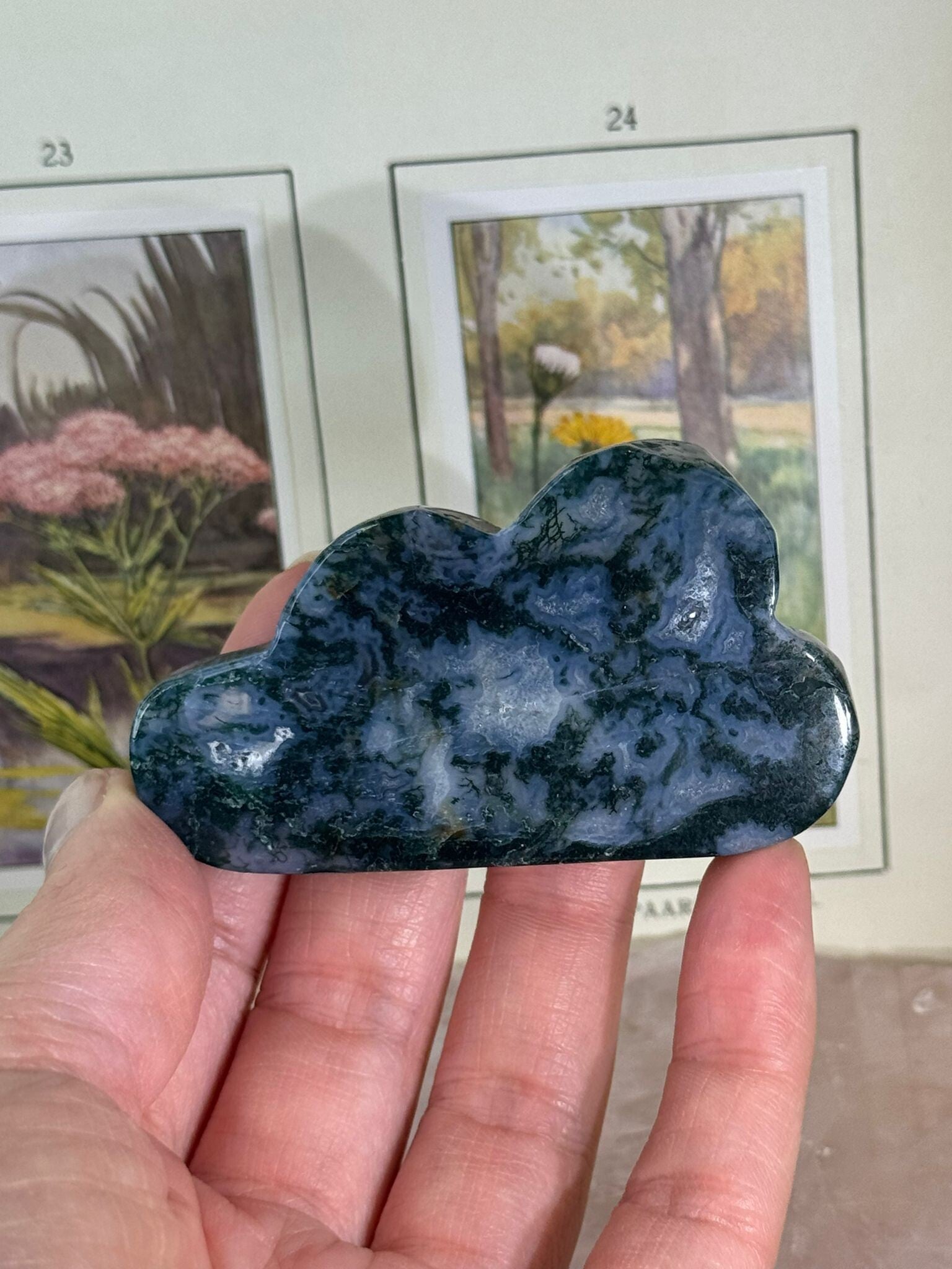 Mosagaat is een prachtige variëteit van agaat die eruitziet alsof er kleine mosjes of takjes in de steen zijn gegroeid. Het geheim zit in de insluitsels van mineralen, meestal groen van kleur, die doorzichtig of wit kwarts doorkruisen. Daardoor lijkt elke steen een mini-landschapje op zichzelf.