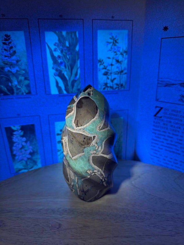 Je vindt septarie onder andere in Madagaskar, de Verenigde Staten en Marokko, en geen enkel stuk is ooit hetzelfde. De meeste septarie bevat calciet dat UV-reactief is en prachtig oplicht onder een UV-lamp, een onverwachte lichtshow van de natuur.