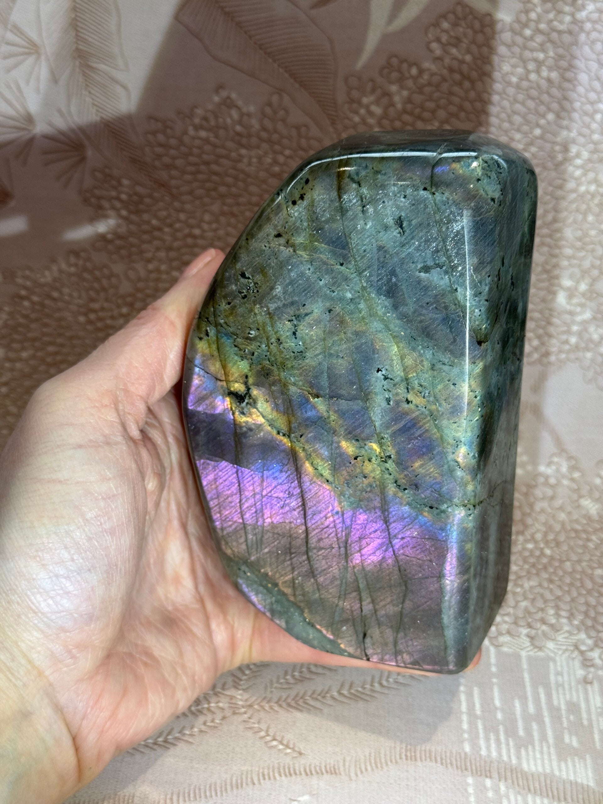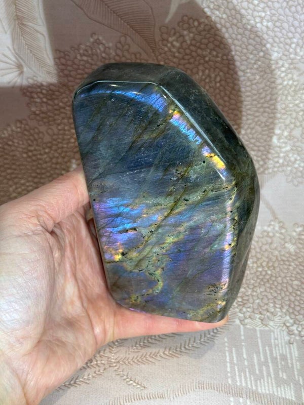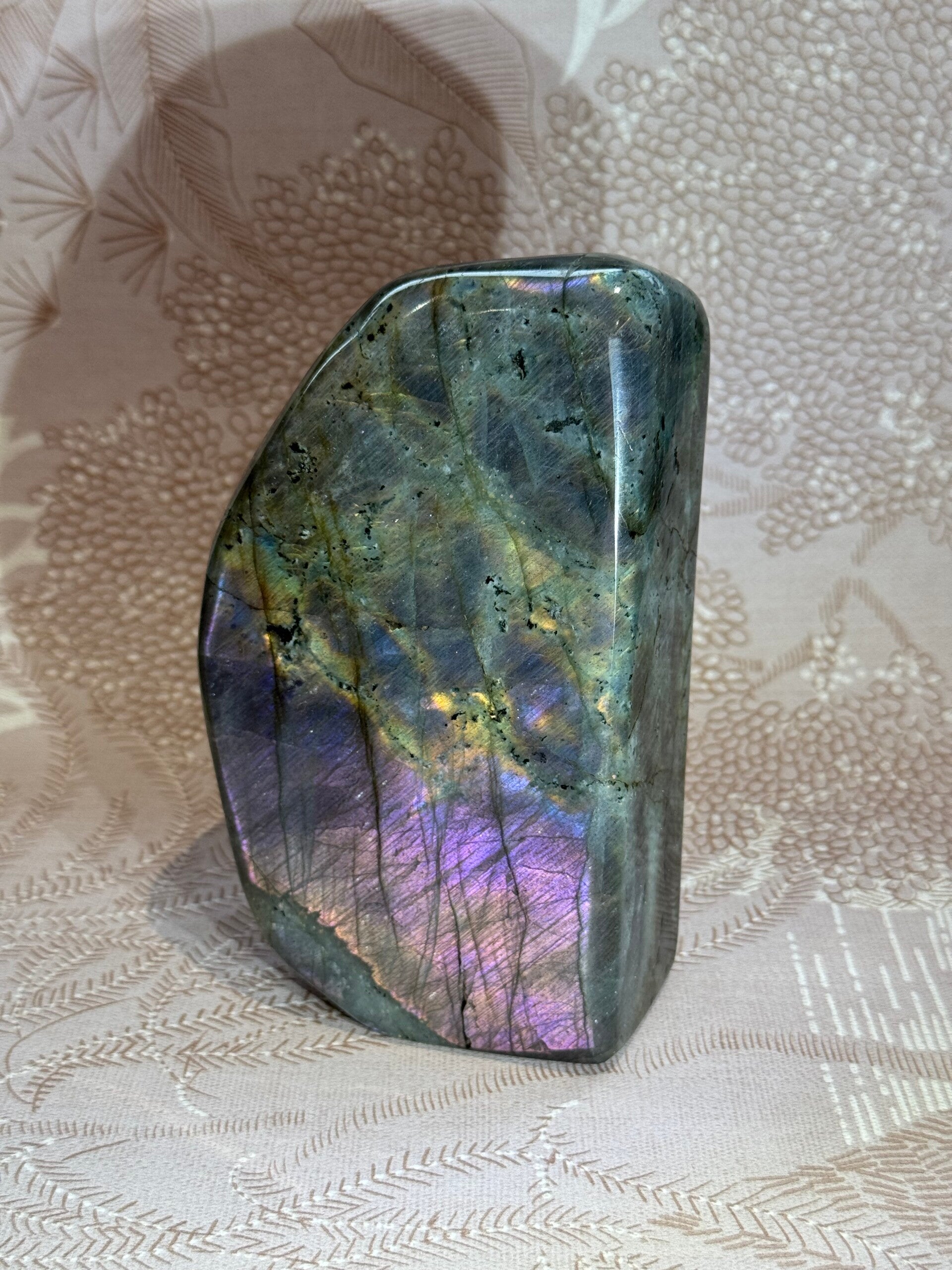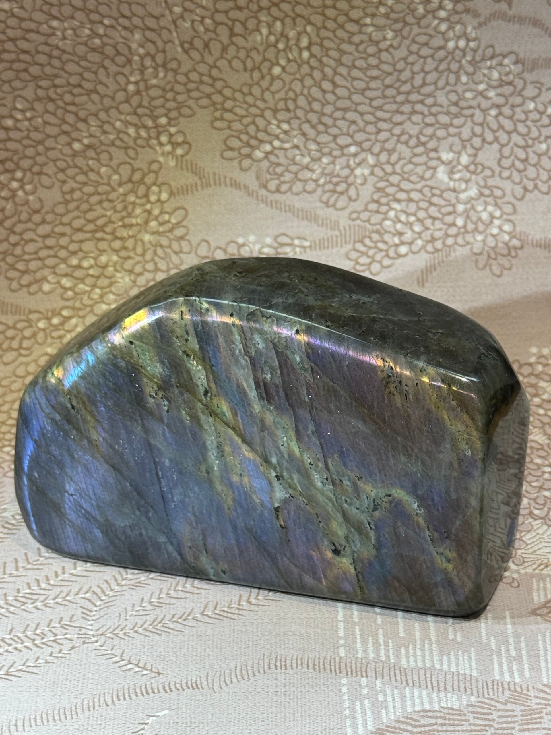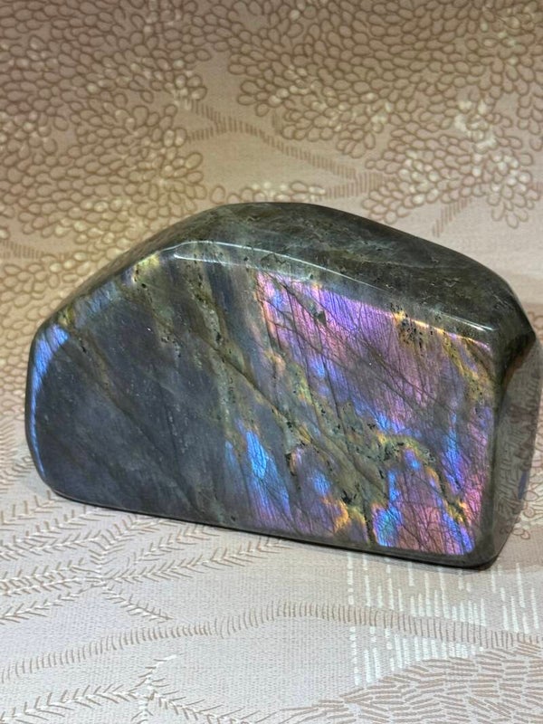Leuk weetje: In sommige culturen werd labradoriet gezien als ‘bevroren noorderlicht’. Men geloofde dat het licht van de aurora borealis in de steen gevangen zat, bij Paarse Labradoriet lijkt dat verhaal haast waar.