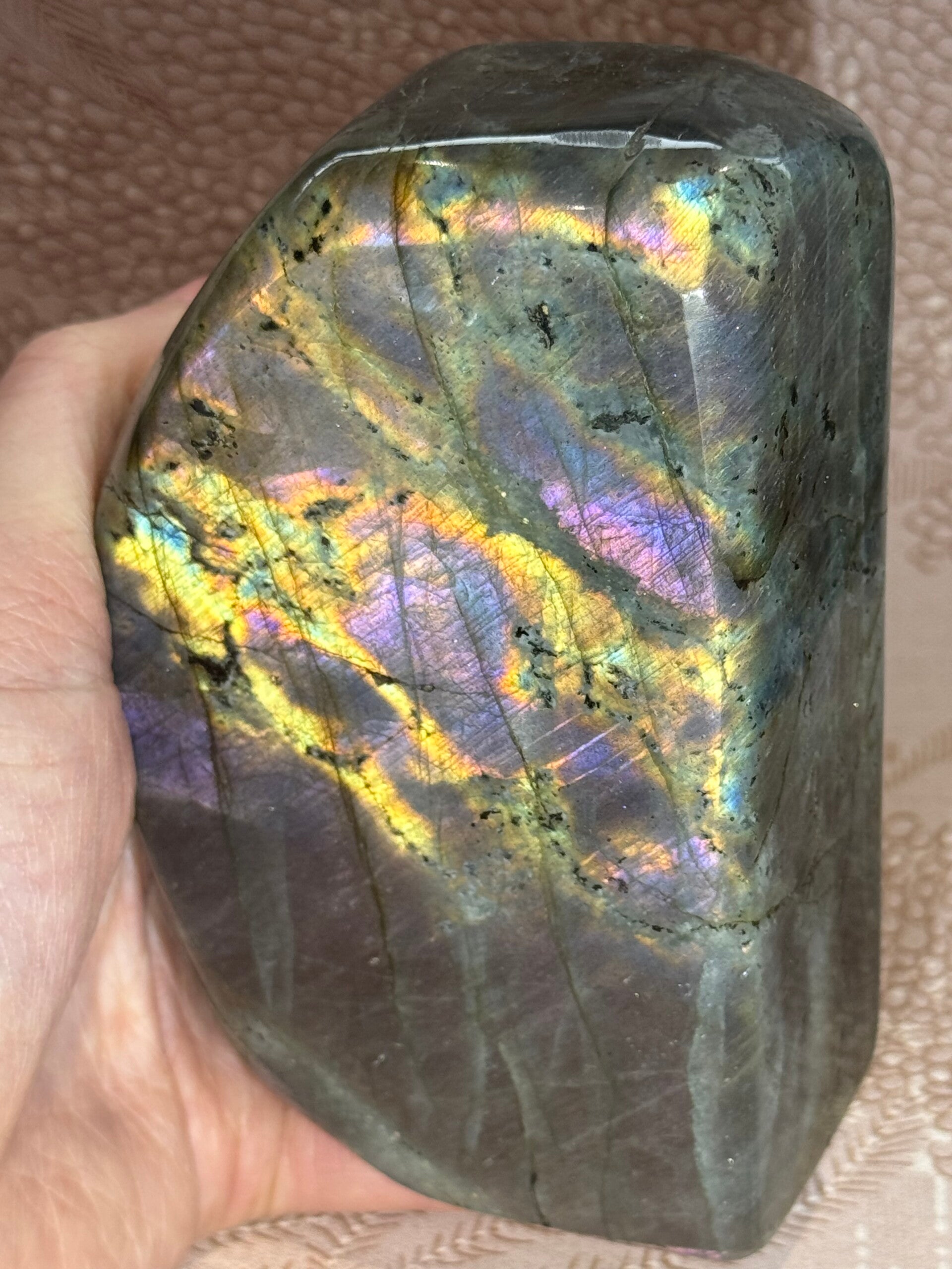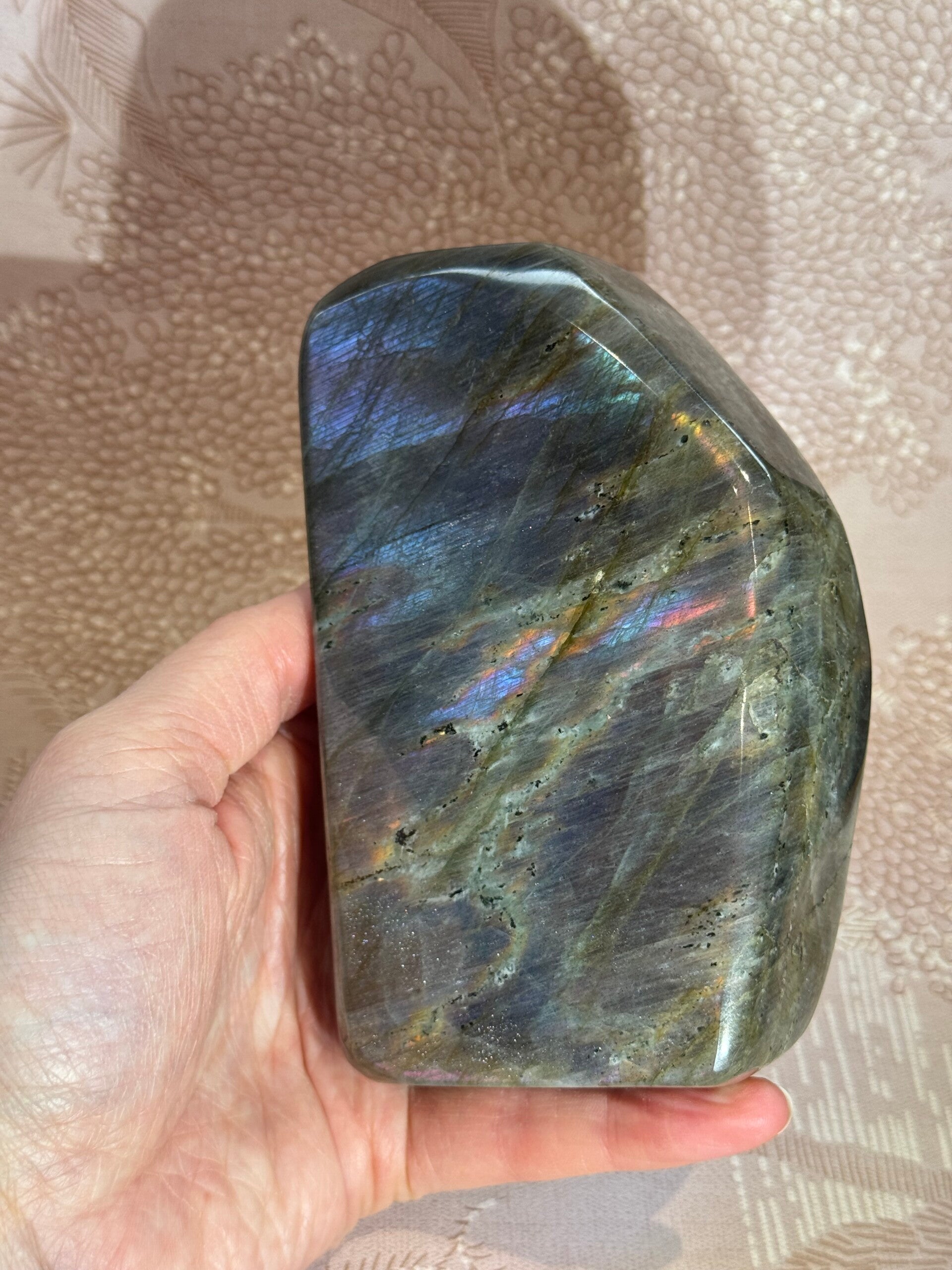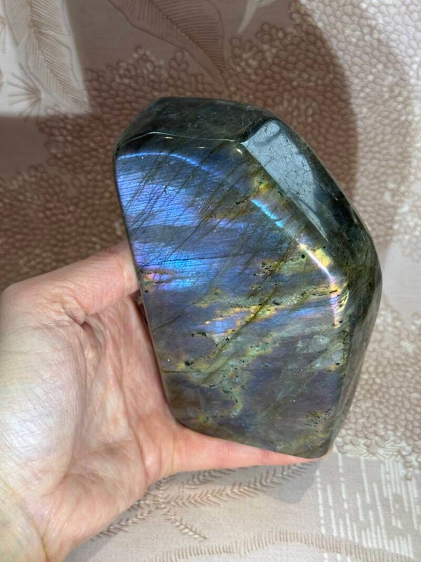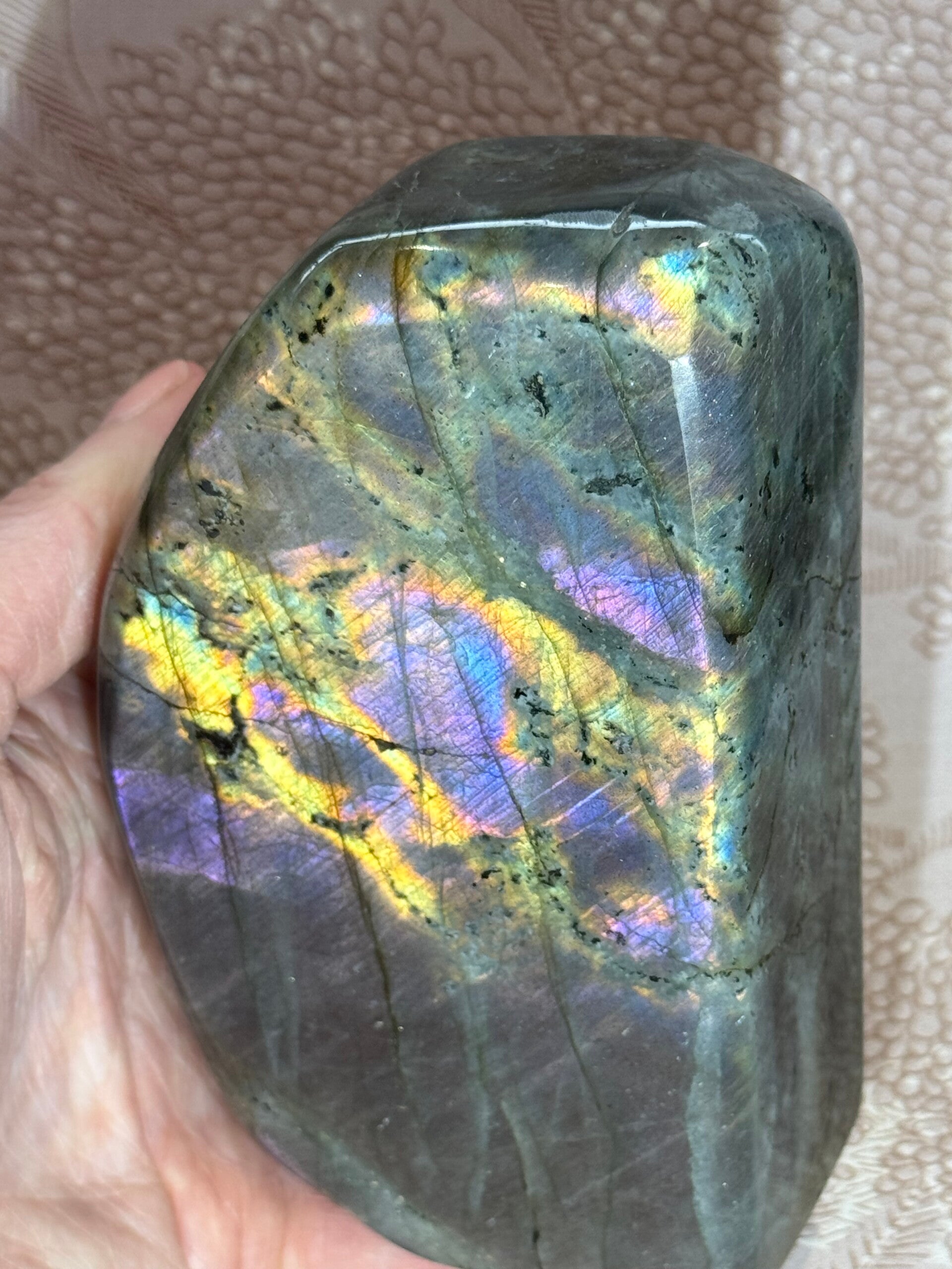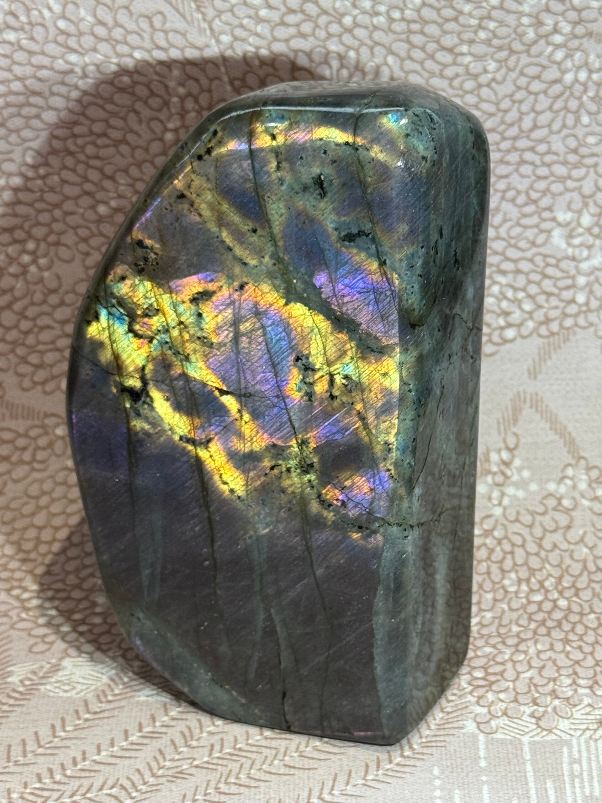 Leuk weetje: In sommige culturen werd labradoriet gezien als ‘bevroren noorderlicht’. Men geloofde dat het licht van de aurora borealis in de steen gevangen zat, bij Paarse Labradoriet lijkt dat verhaal haast waar.