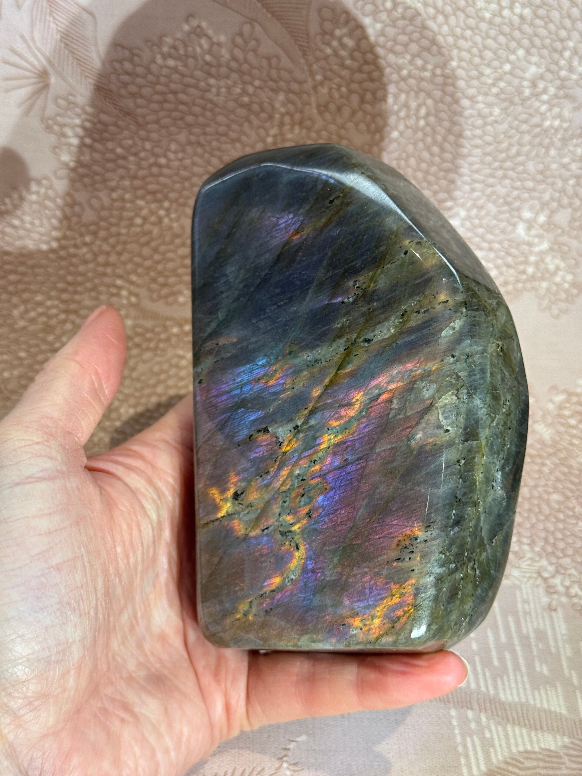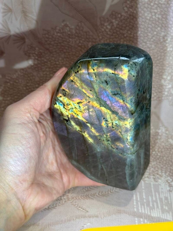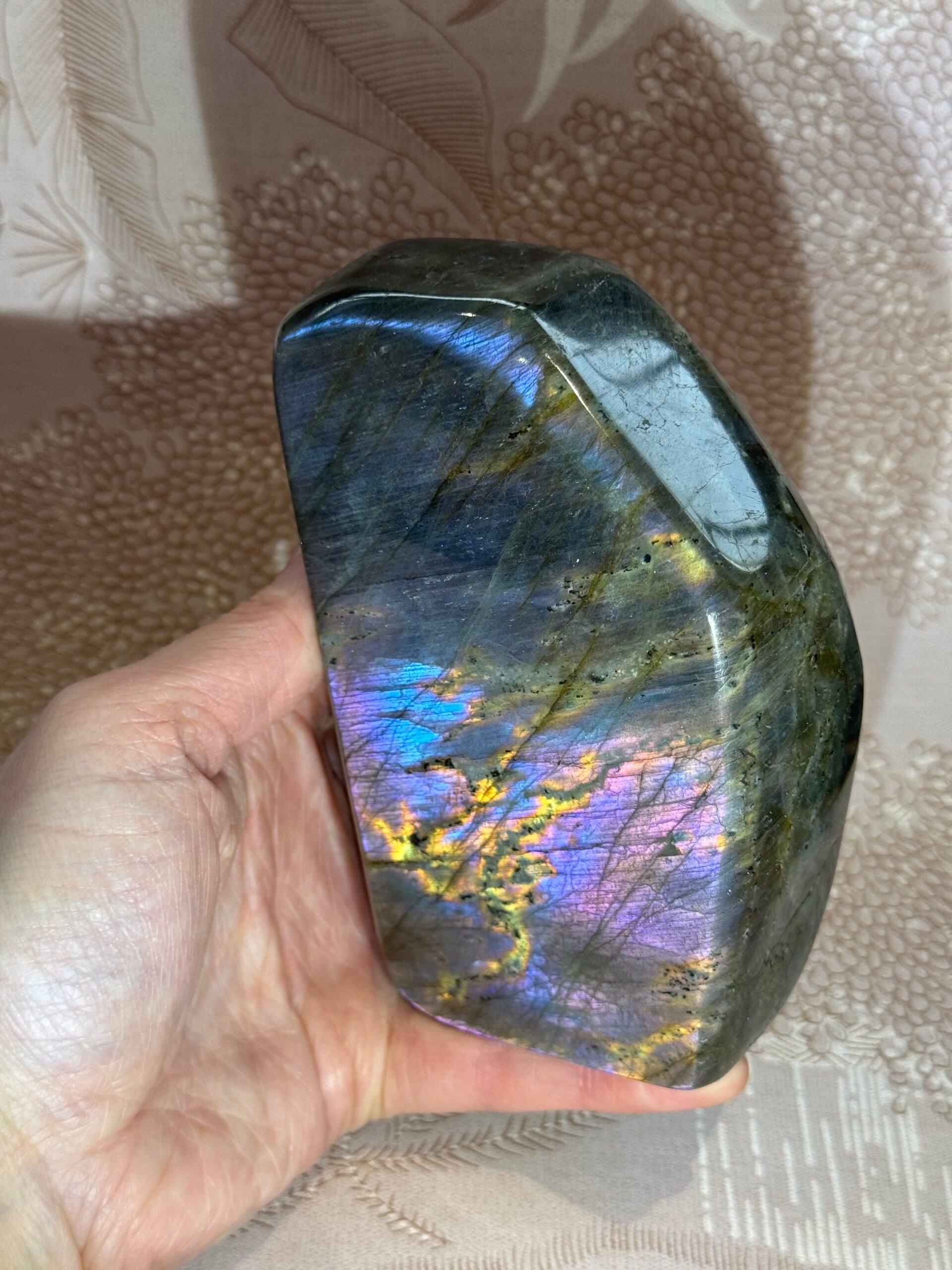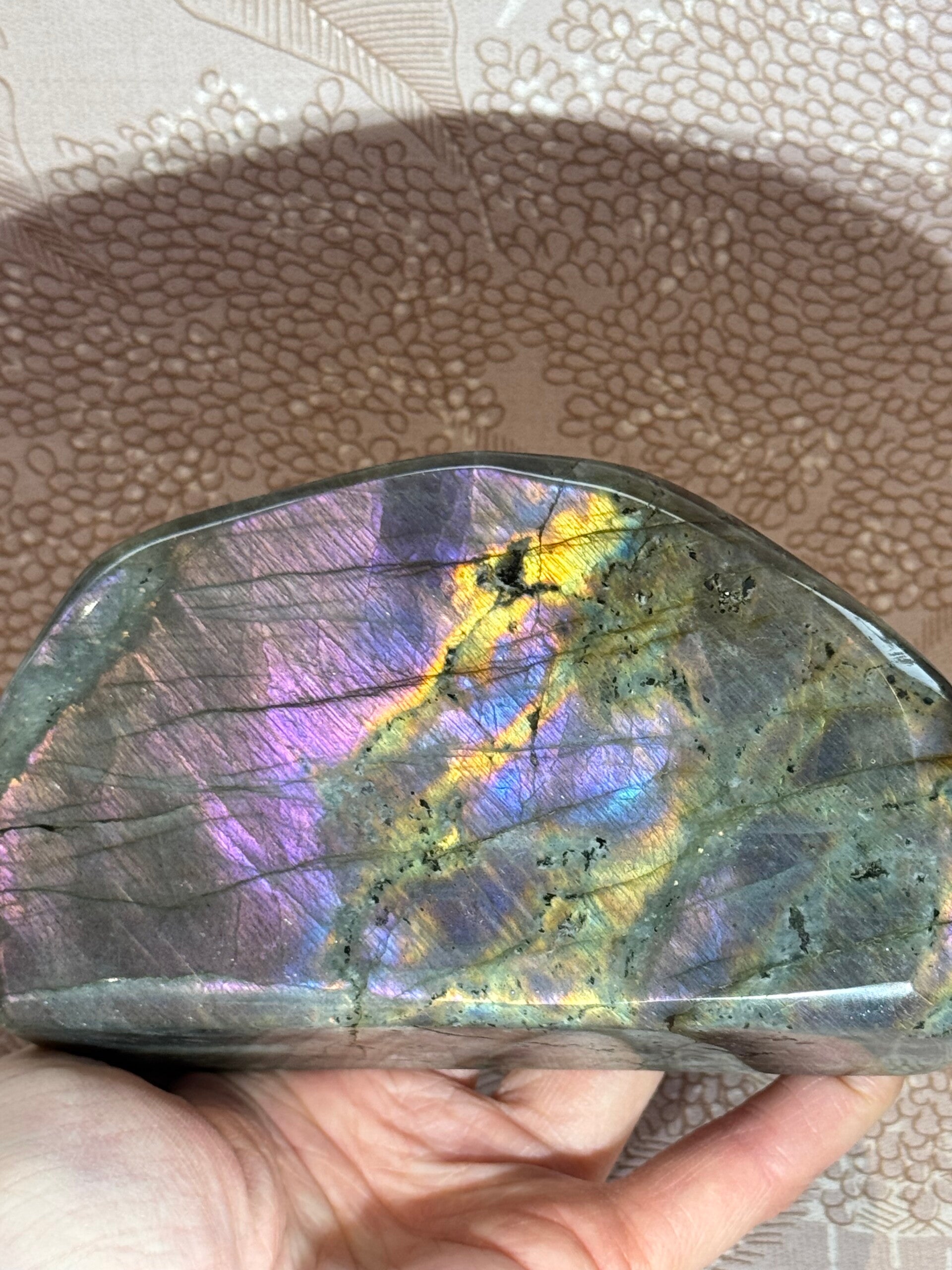 Leuk weetje: In sommige culturen werd labradoriet gezien als ‘bevroren noorderlicht’. Men geloofde dat het licht van de aurora borealis in de steen gevangen zat, bij Paarse Labradoriet lijkt dat verhaal haast waar.