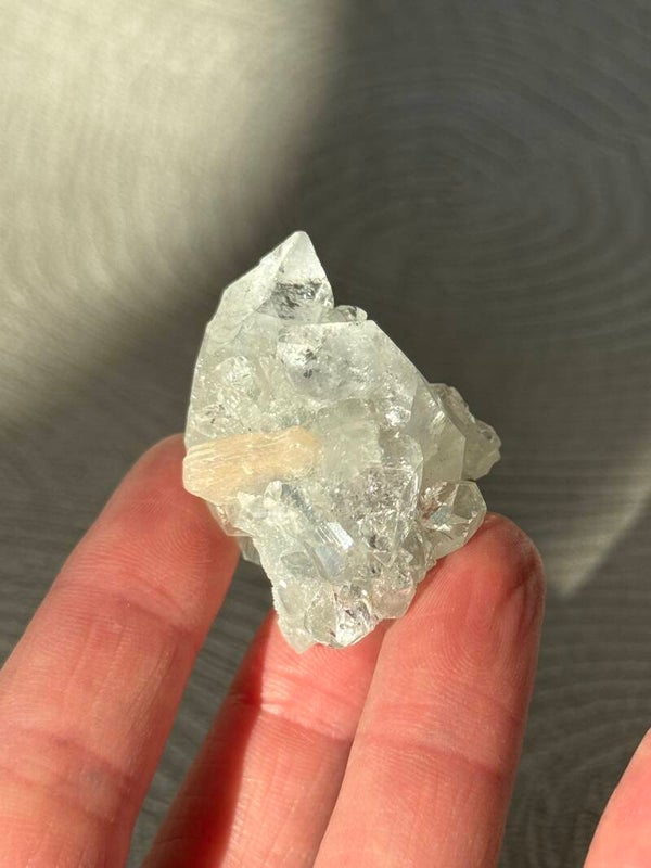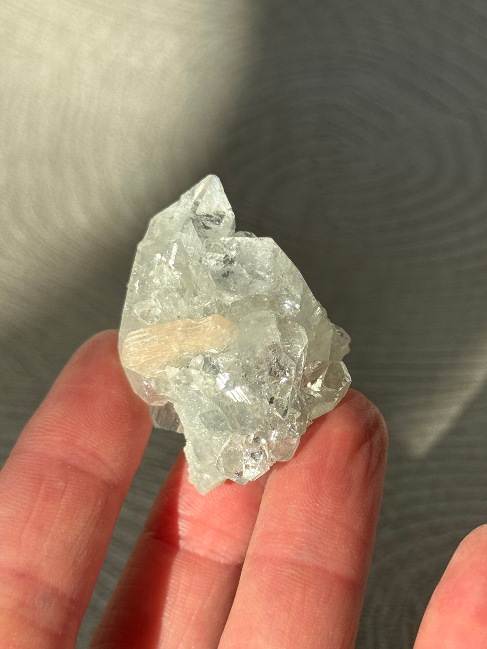 Apofyliet is een sprankelend mineraal dat vaak verschijnt als doorzichtige, witte, groene of zachtroze kristallen met een prachtige natuurlijke glans. De geometrische vormen, vaak piramide of kubusachtig, geven apofyliet zijn herkenbare, bijna buitenaardse uitstraling. Je ziet ’m vaak groeien op zeolietmatrix, waar hij als kleine lichtjes bovenop andere mineralen schittert.