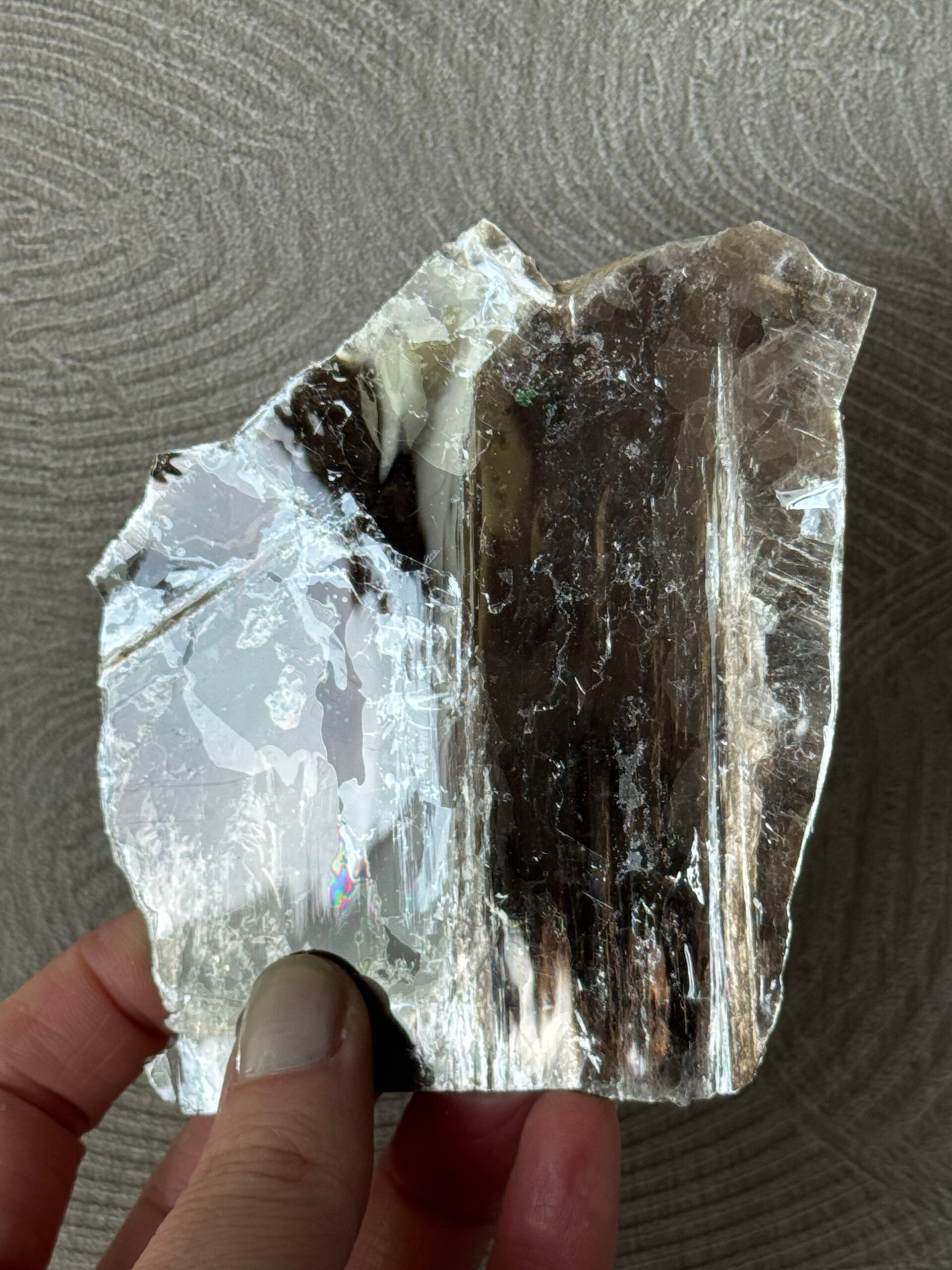 Biotiet is een donker glanzend mineraal dat eruitziet als laagjes flinterdun gesteente boven op elkaar – en dat is het ook! Deze zwarte tot bruinzwarte mica heeft een stille, maar krachtige uitstraling. Alsof hij liever observeert dan op de voorgrond treedt.