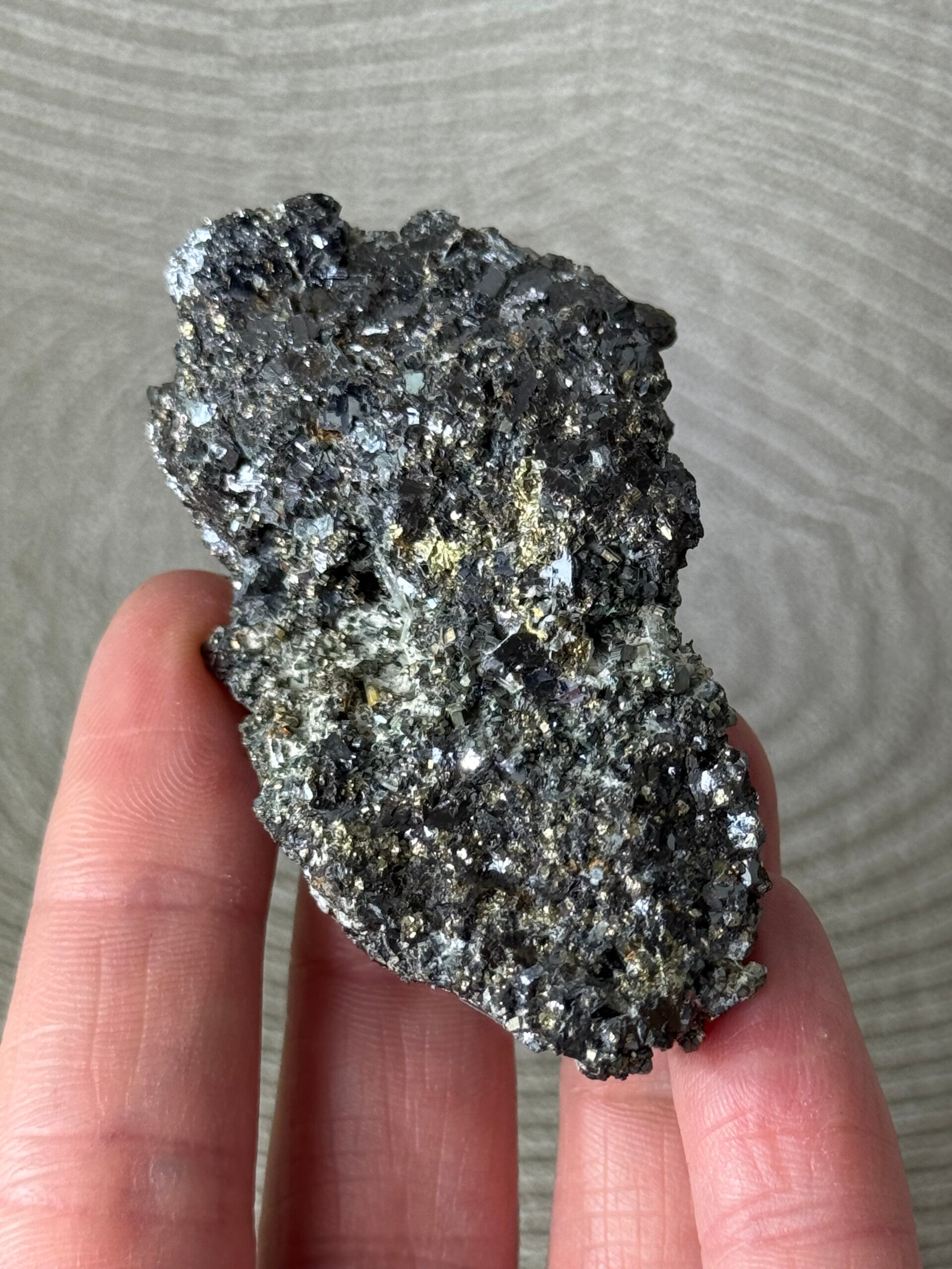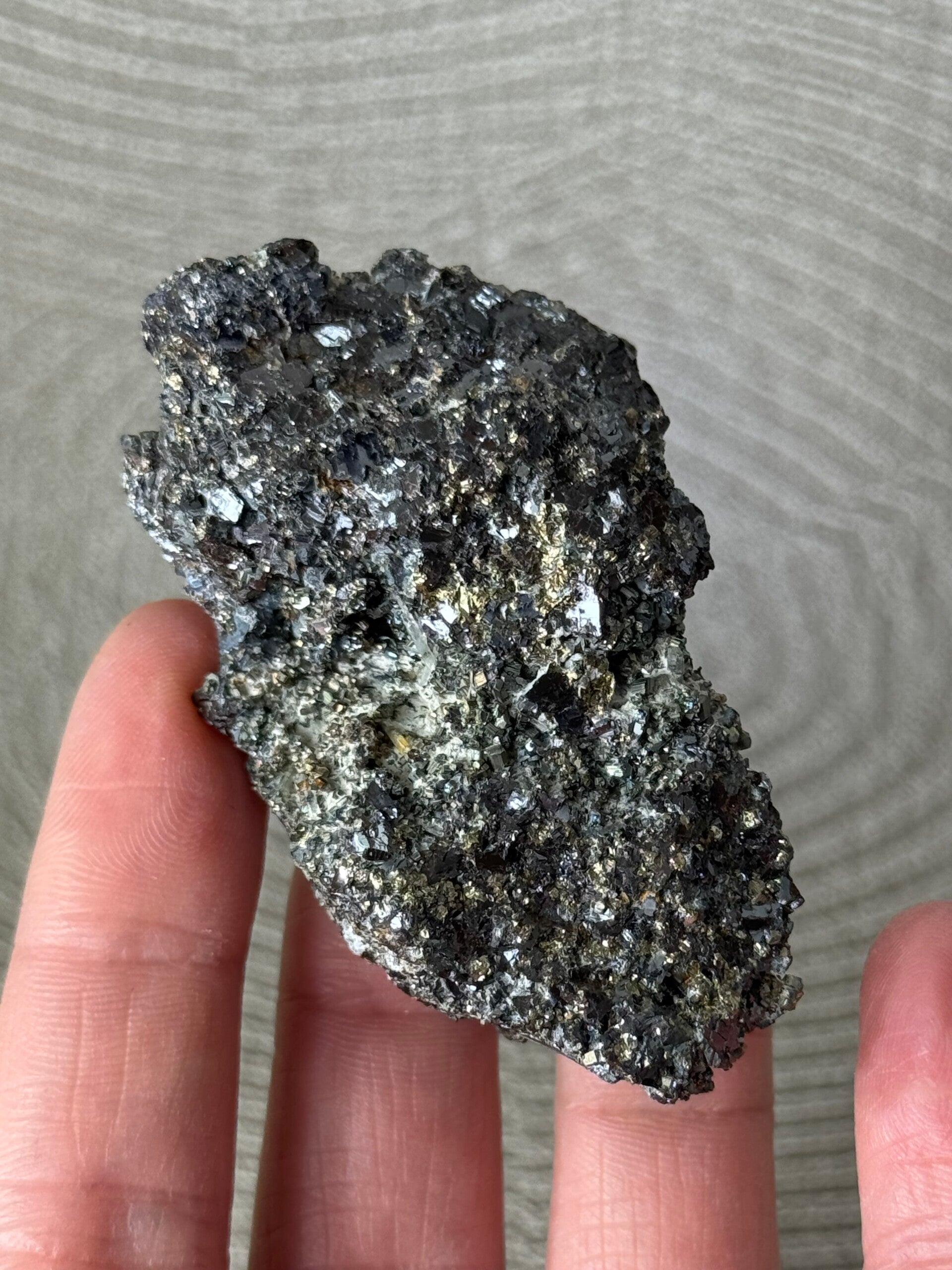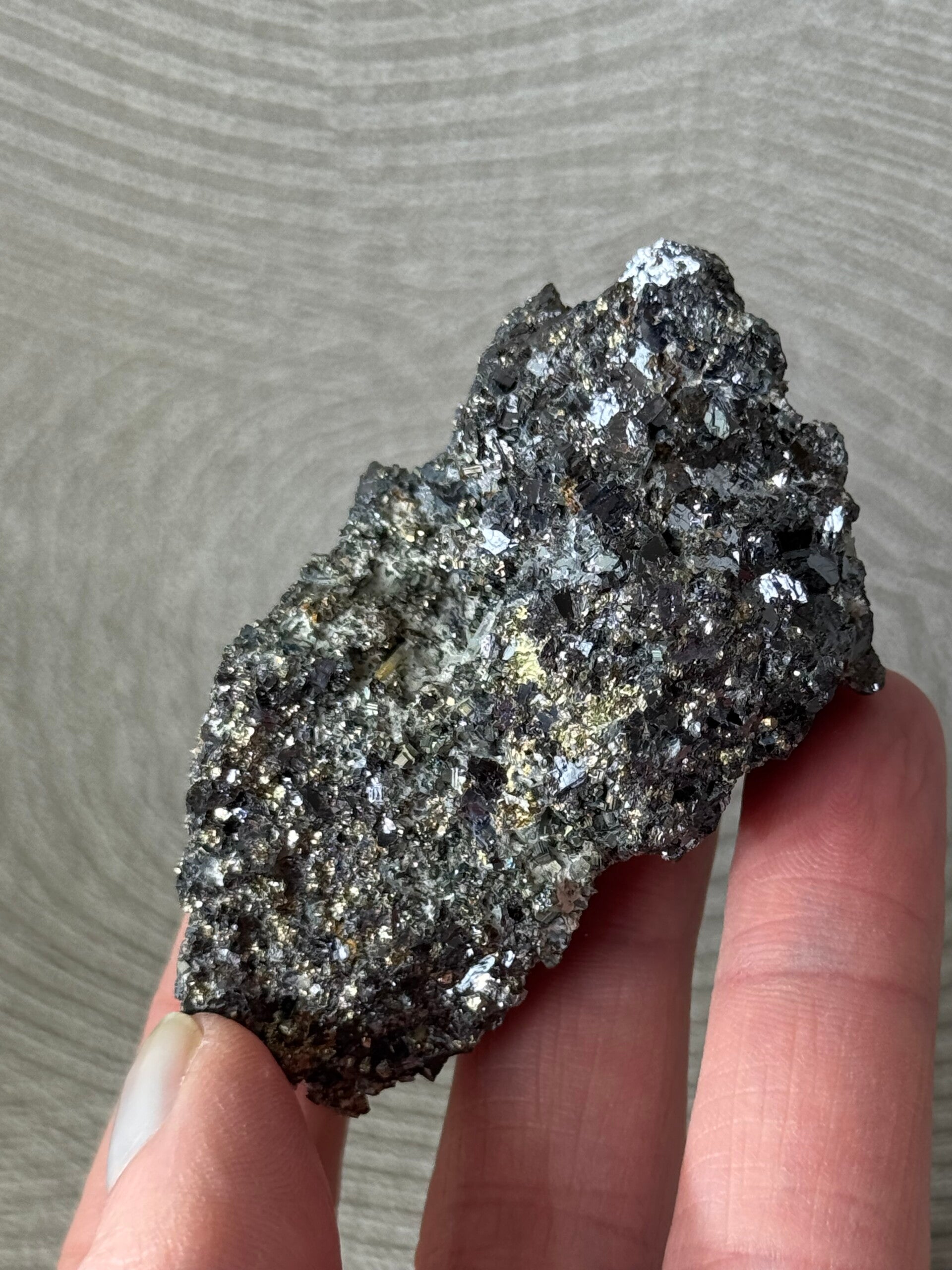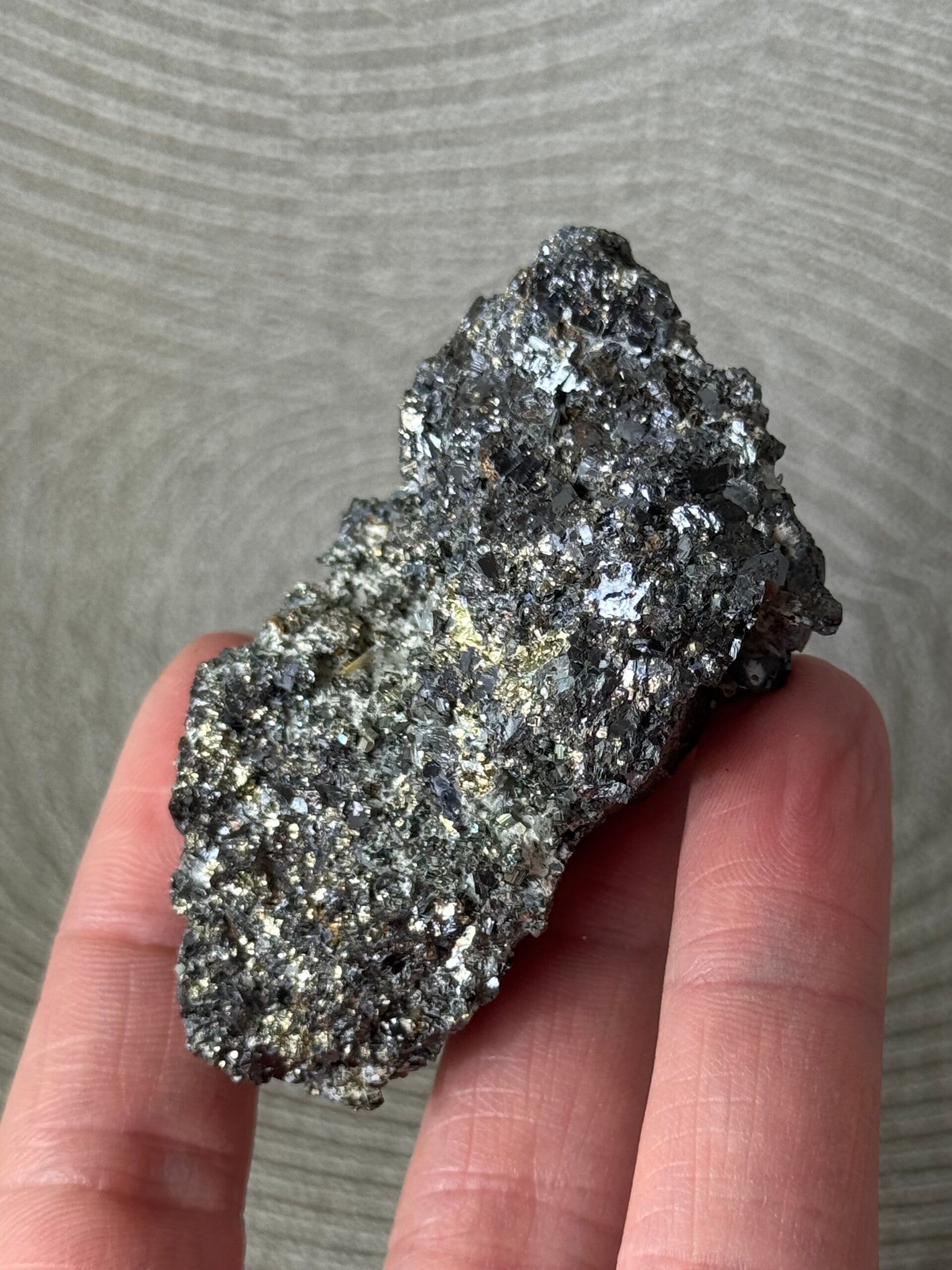 Galeniet is een mineraal dat meteen opvalt door zijn metalen glans en vaak strakke, kubusvormige kristallen. Het ziet eruit alsof het van zilver is gemaakt, maar in werkelijkheid is het een looderts – en daardoor verrassend zwaar voor zijn formaat. Til hem maar eens op, en je snapt meteen waarom galeniet vaak dé verrassing is in een stenenverzameling.
