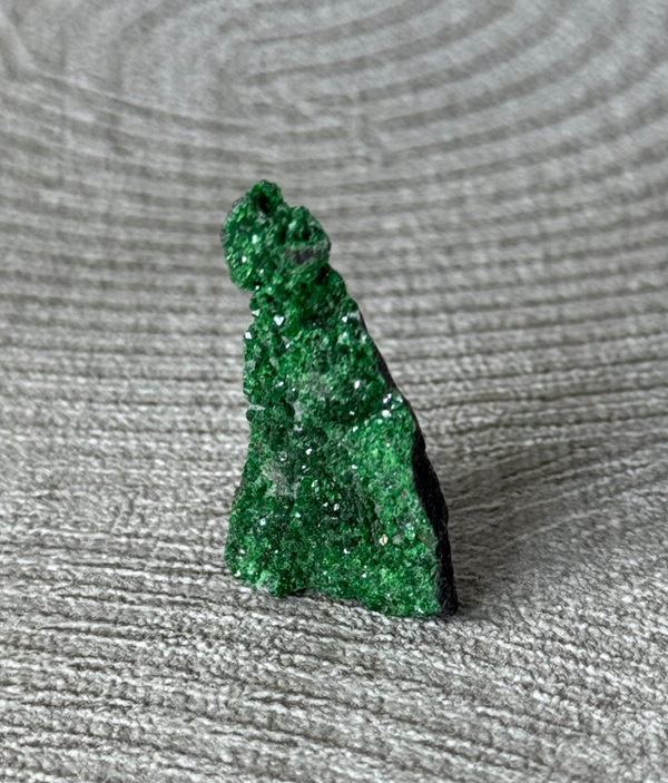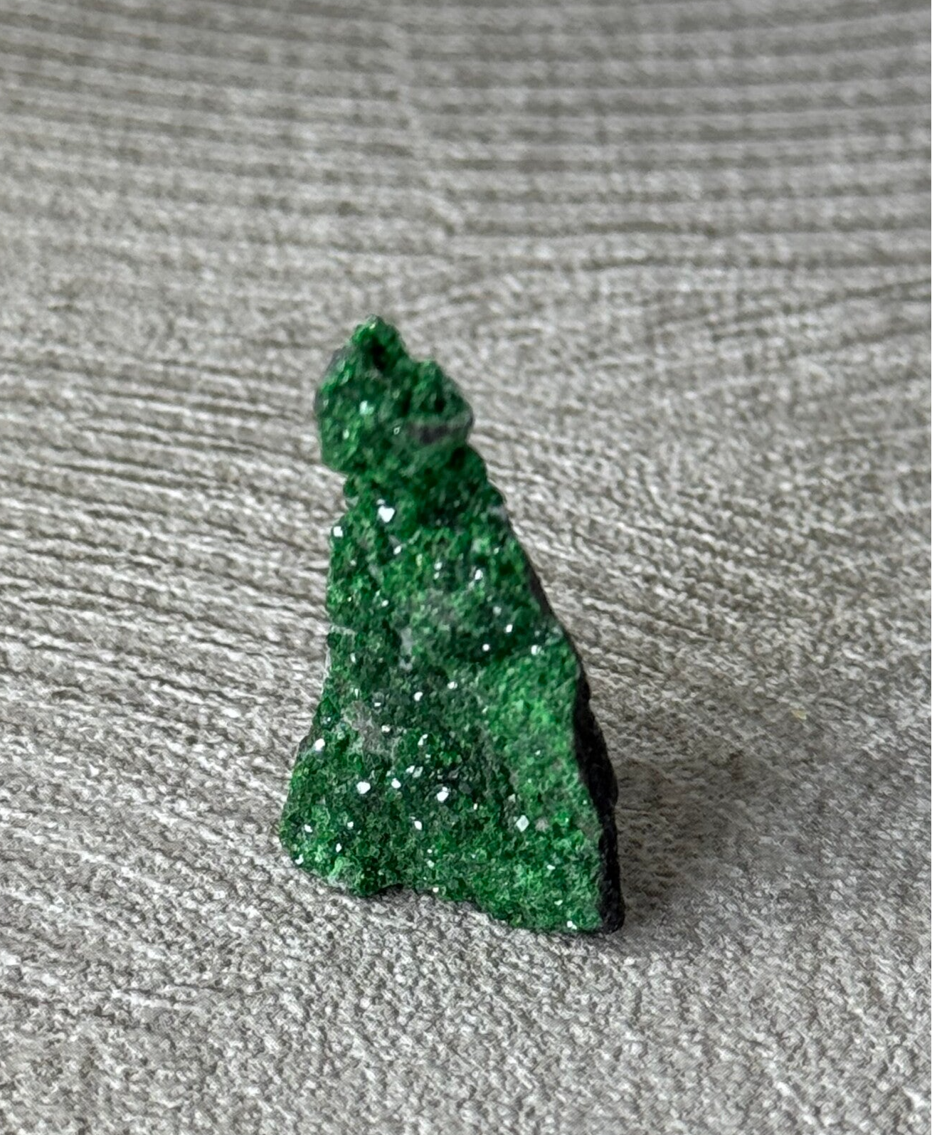 Uwarowiet is een zeldzame en sprankelende groene granaatsoort die meteen de aandacht pakt. Deze prachtige edelsteen vormt vaak een laagje van piepkleine kristalletjes op donkere rots, waardoor het lijkt alsof er groene suiker overheen is gestrooid. De kleur varieert van fris limoengroen tot diep smaragd, helemaal natuurlijk, zonder bijkleuring.