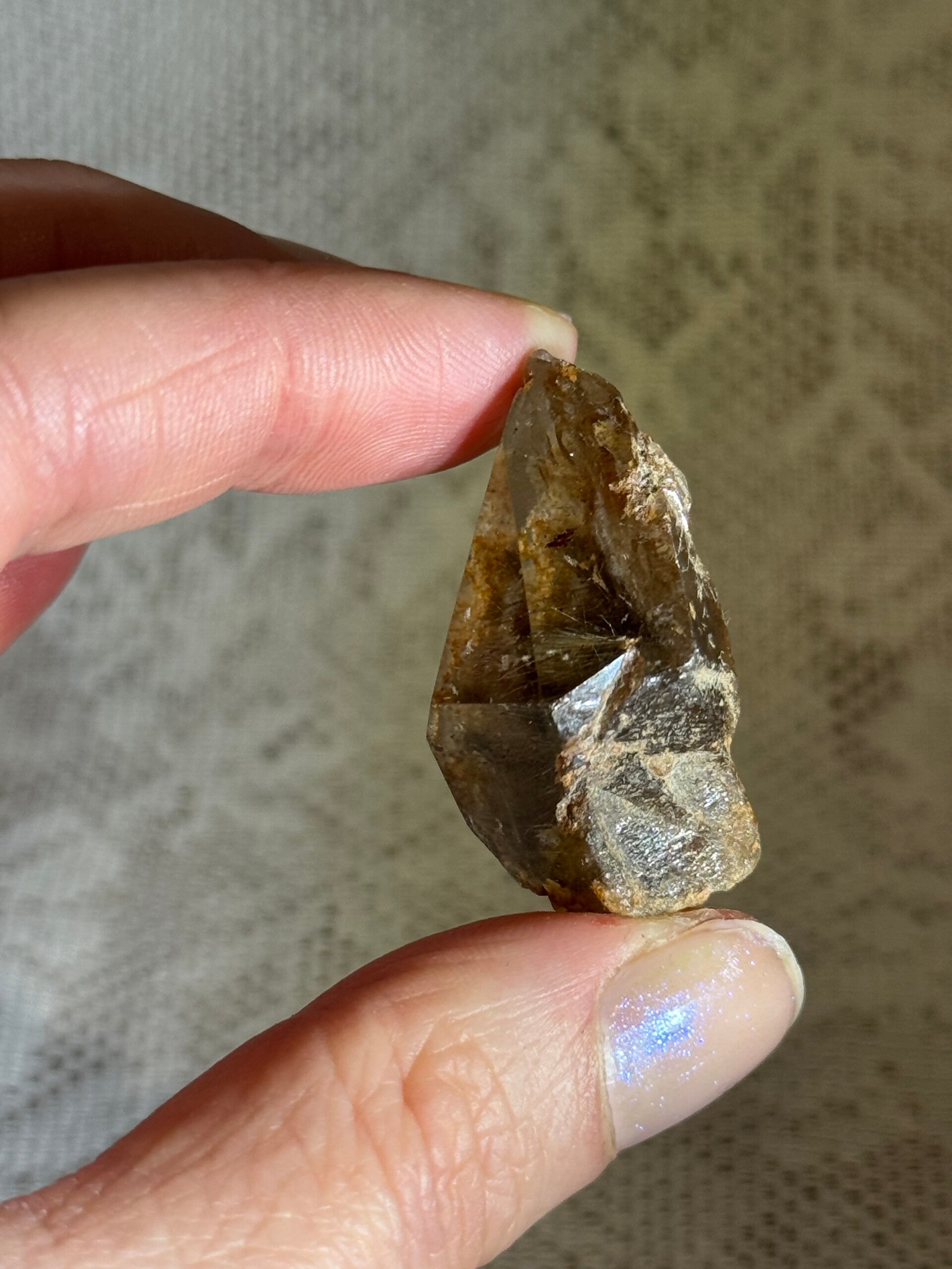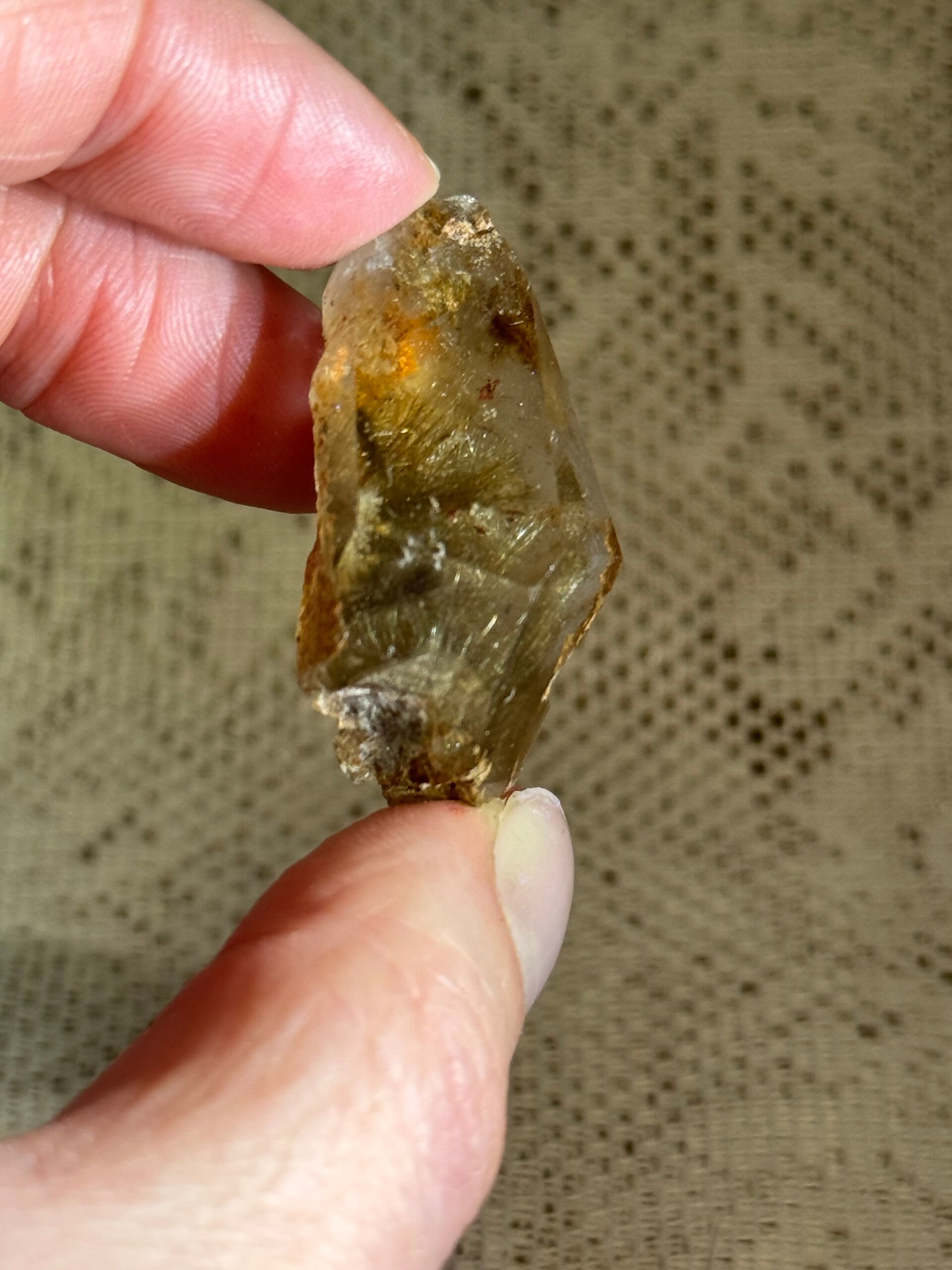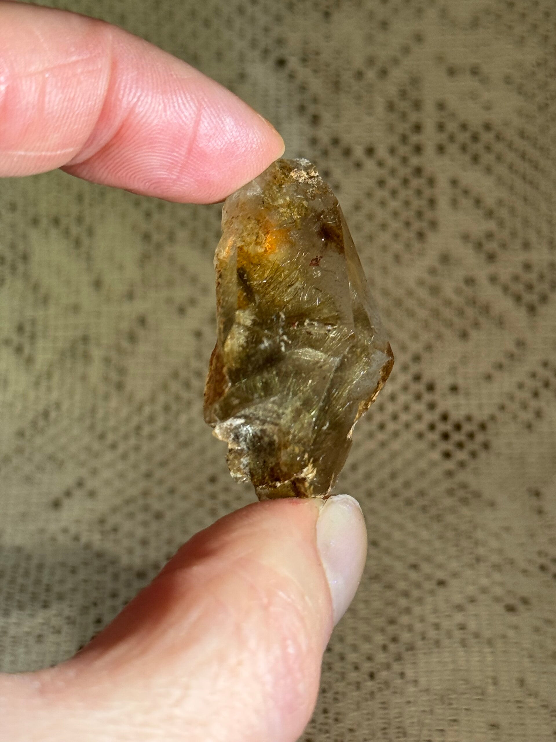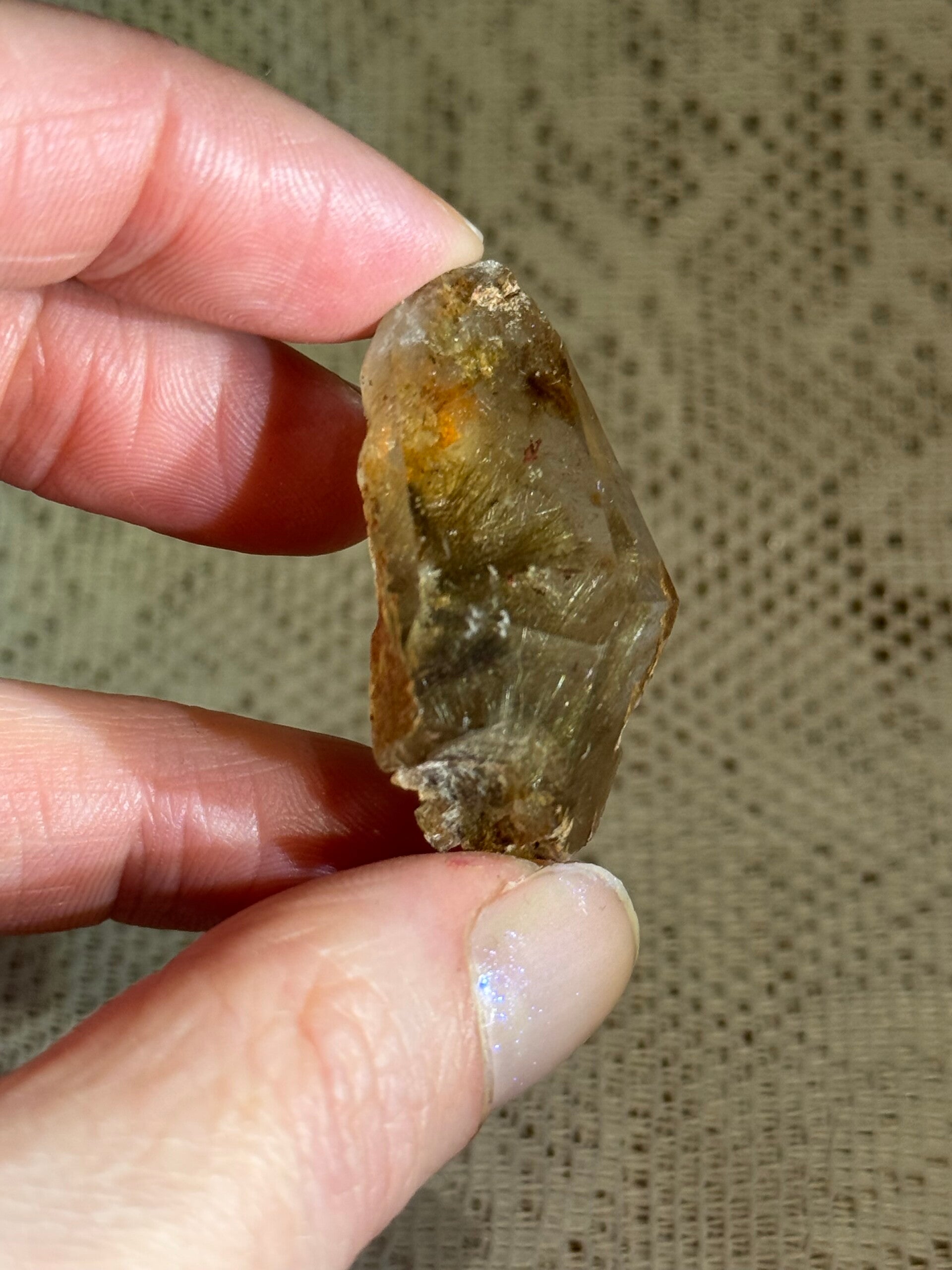 Rutiel is een bijzondere kwartsvariant met fijne, glinsterende haartjes van rutiel erin. Deze haartjes lijken op zilveren draadjes die door de steen lopen en geven het kristal een warme, sprankelende uitstraling. Elke steen is uniek, want de patronen van de draadjes variëren van subtiel tot opvallend dramatisch.