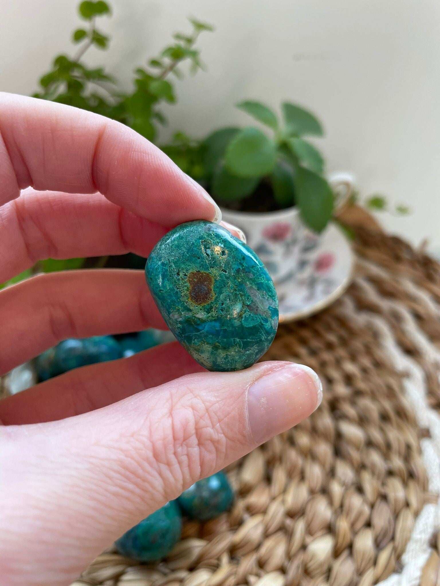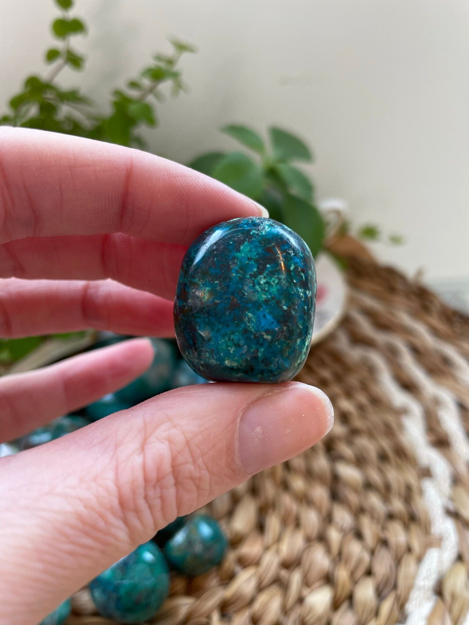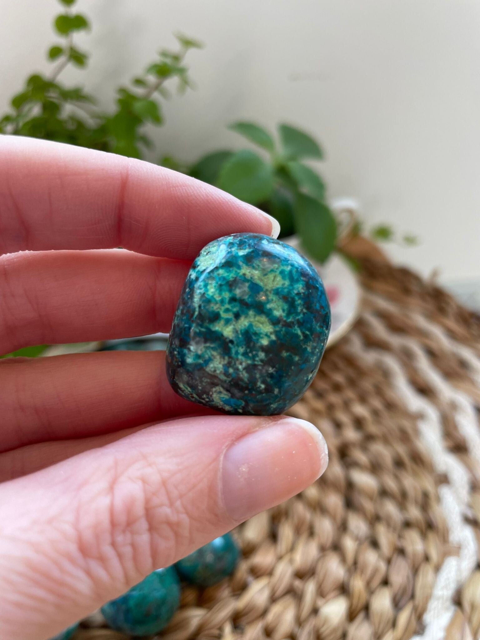 Chrysocolla is een steen die je meteen meeneemt op reis door z’n prachtige mix van groenblauwe tinten. Soms lijkt hij op turquoise water, dan weer op diep bosgroen. Geen steen is hetzelfde, waardoor elke chrysocolla een klein kunstwerkje van de natuur is.
