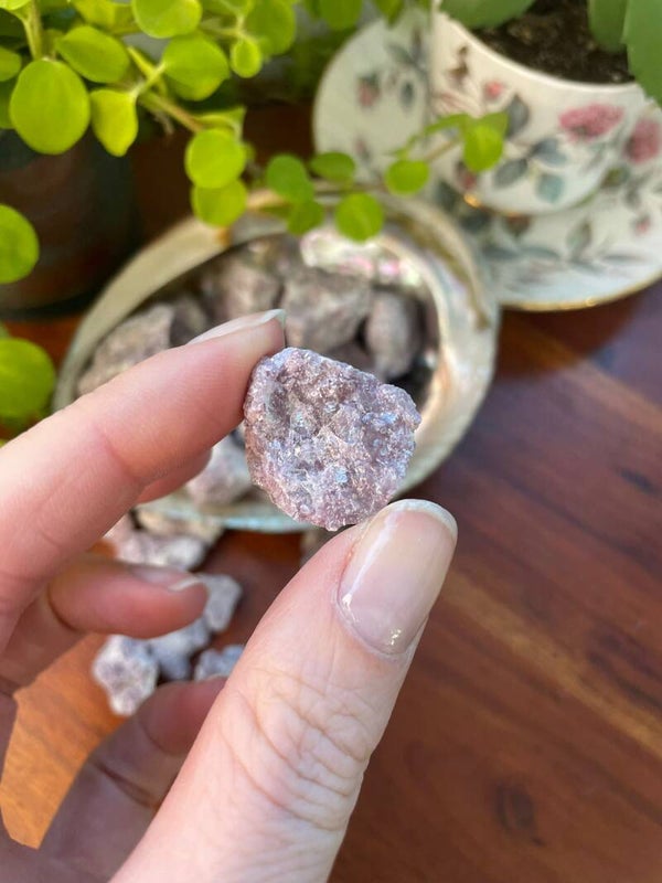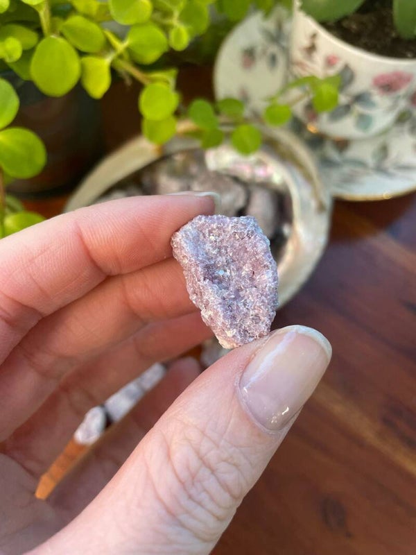 Leuk weetje: De naam ‘lepidoliet’ komt van het Griekse lepidos, wat ‘schub’ betekent, een knipoog naar de glinsterende laagjes die deze steen z’n kenmerkende uiterlijk geven.