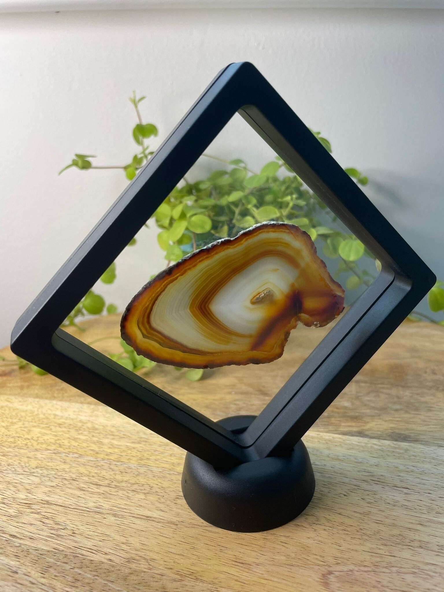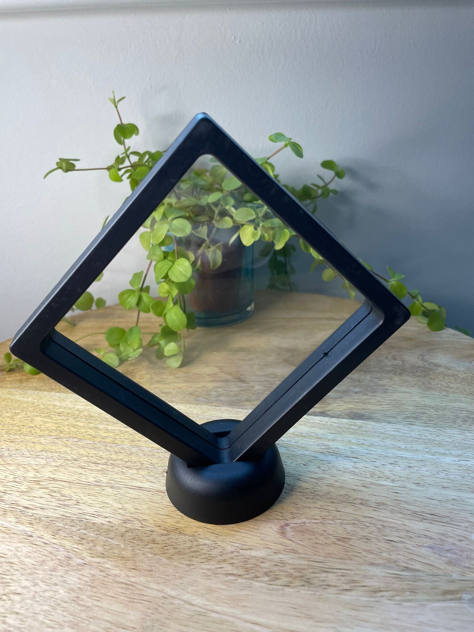 Deze Frames zijn zo mooi voor het "laten zweven" van schijfjes of andere mooie edelstenen. De laatste drie foto's geven een voorbeeld van wat je er mee kan doen! :) De frame wordt geleverd met het ronde voetje.Breedte: 11cmHoogte: 11cm