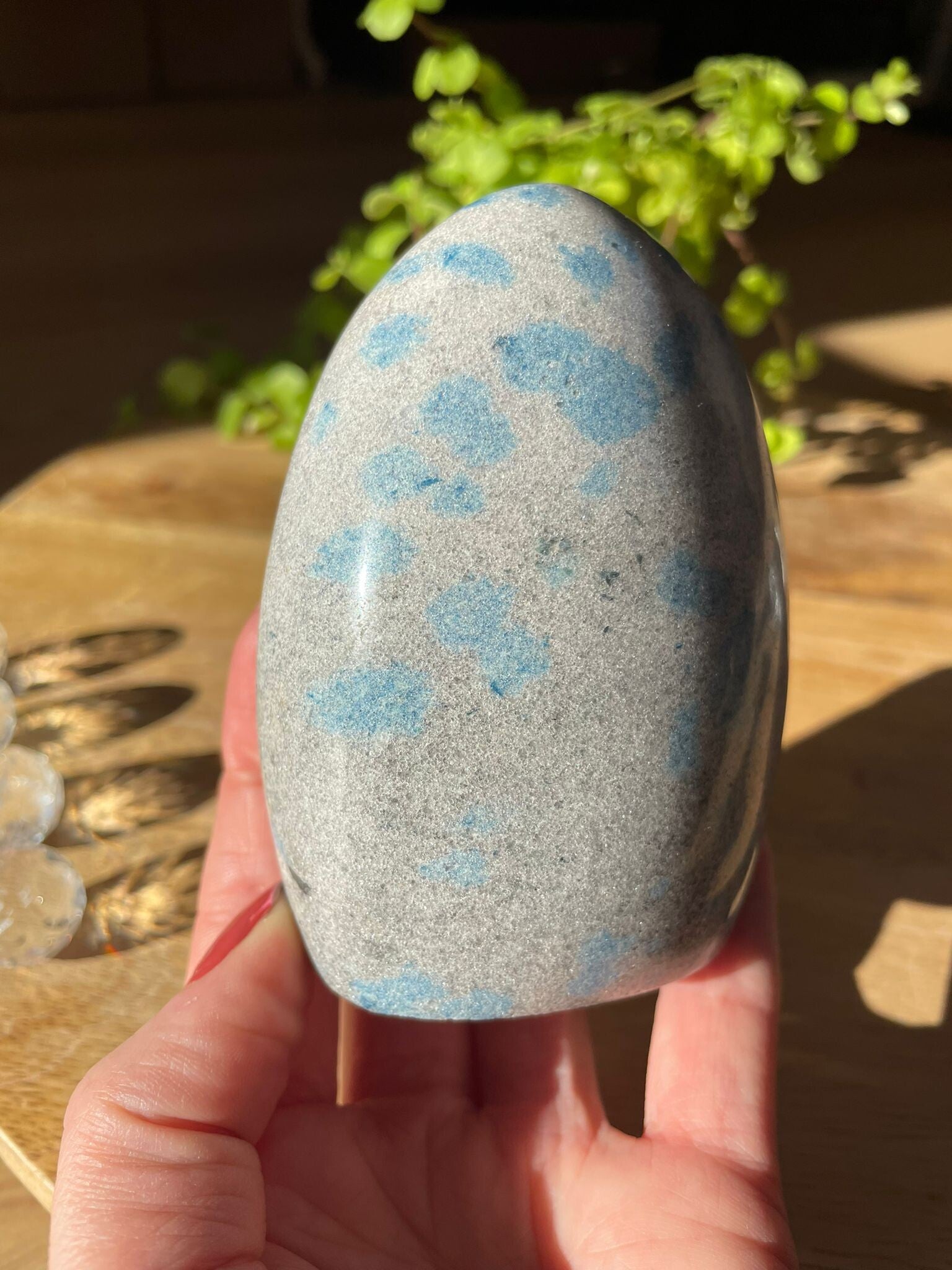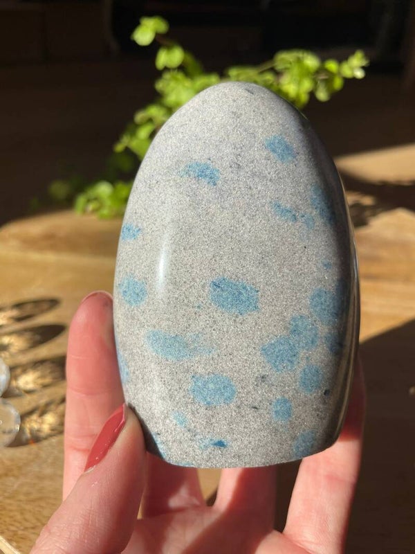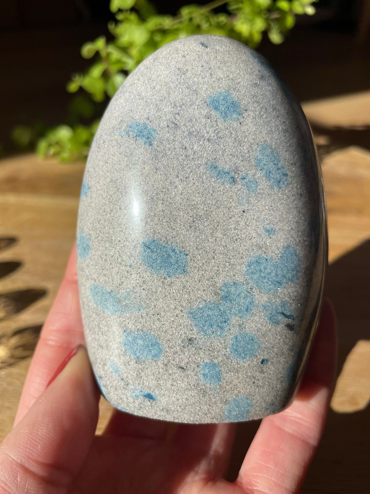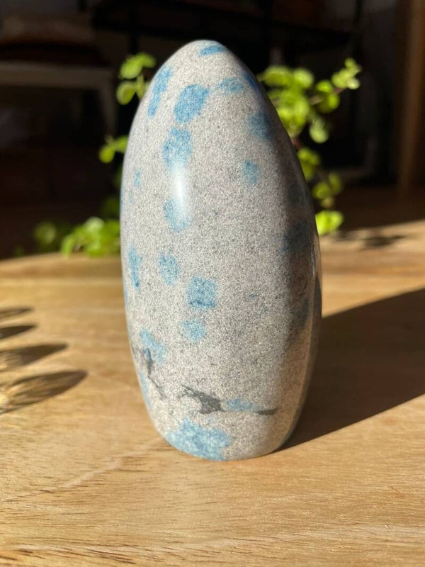 K2 is een opvallende steen die zijn naam dankt aan de tweede hoogste berg ter wereld, de K2 in Pakistan, waar hij gevonden wordt. Het bijzondere aan deze steen is de combinatie van grijs-blauwe graniet met helderblauwe azuriet-vlekjes, alsof de hemel op aarde neerdaalt. Elke steen is uniek, met een prachtig contrast tussen de rustige grijstinten en de sprankelende blauwe stipjes.